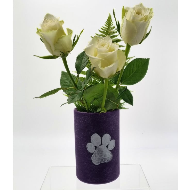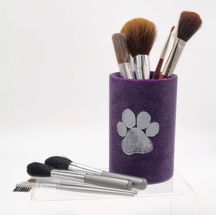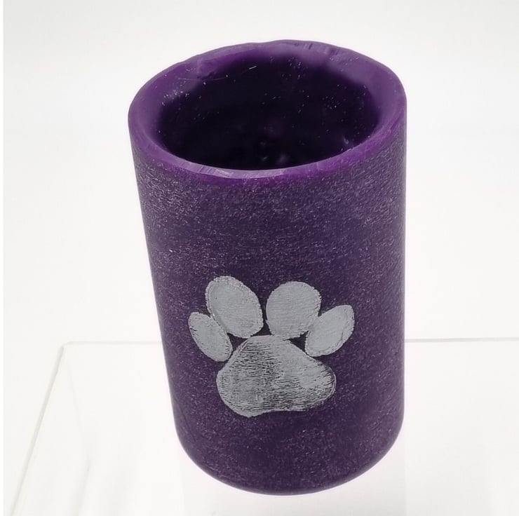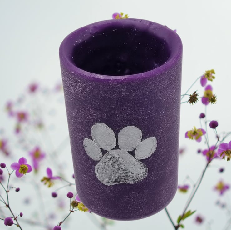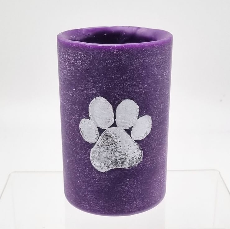 This wax cylinder vase is made of purple wax with a silver paw direction. It is a medium height of 12 cm, and 8 cm wide making it extremely useful for a range of other purposes. A lovely gift for cat and dog lovers.