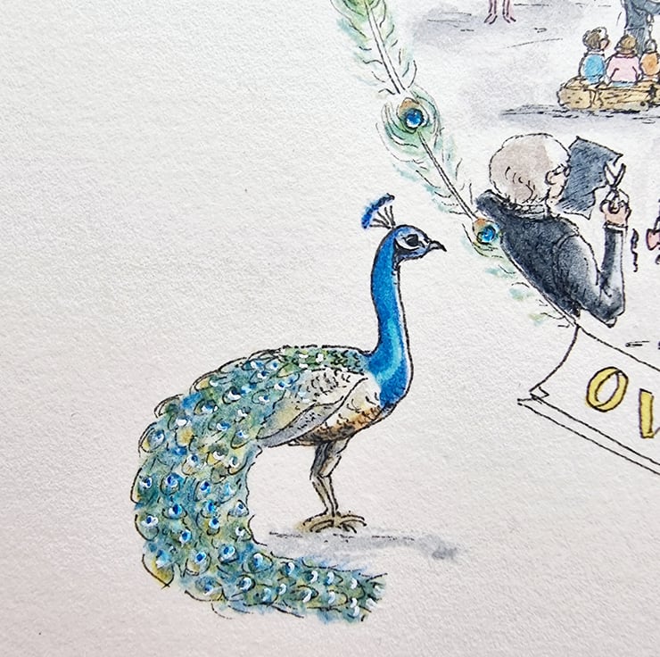 The painting shows the Parade, lead by the Royal British Legion Marching Band, followed by entertainers and villagers in fancy dress!