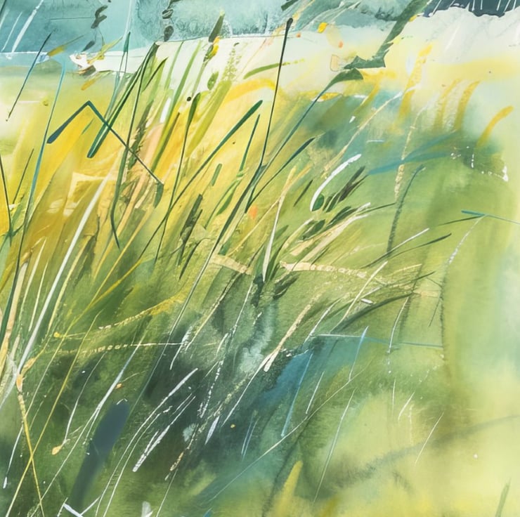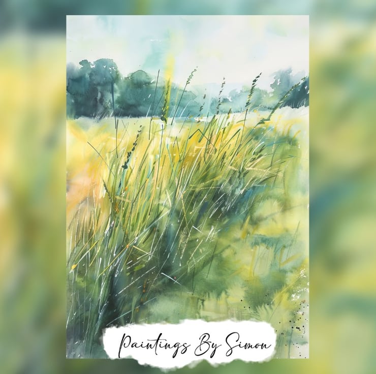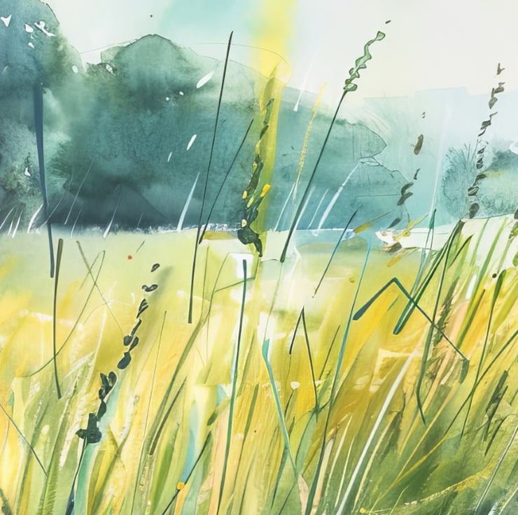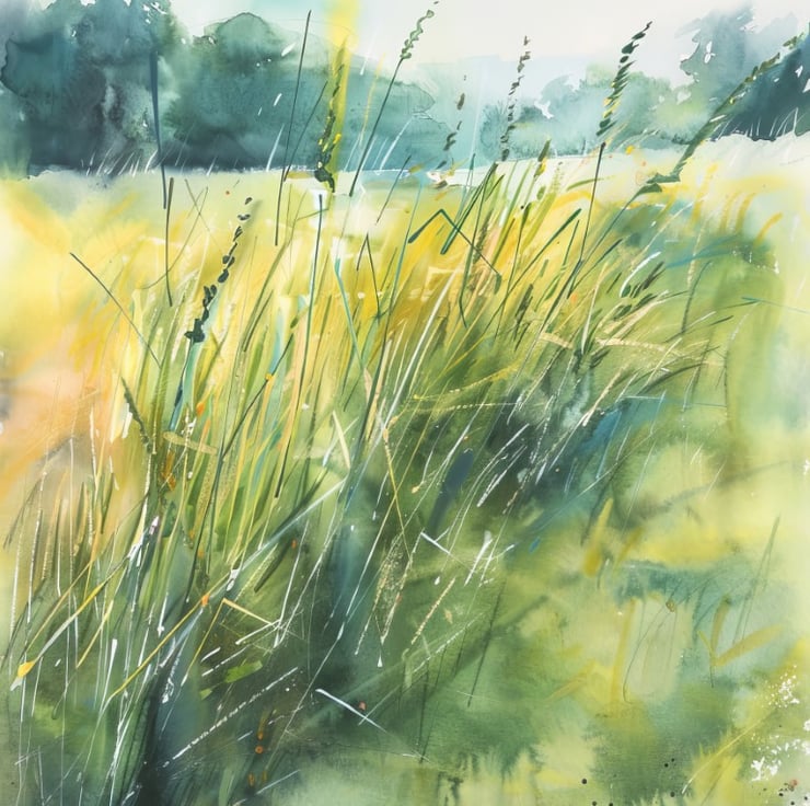 This beautiful watercolor illustration captures the serene beauty of a meadow landscape. Additionally, the scene is dominated by tall, lush green grasses swaying gently in the breeze.