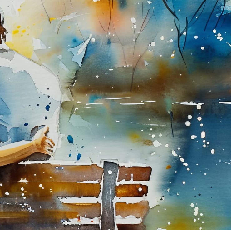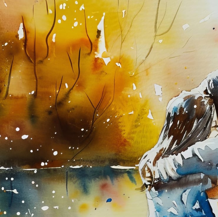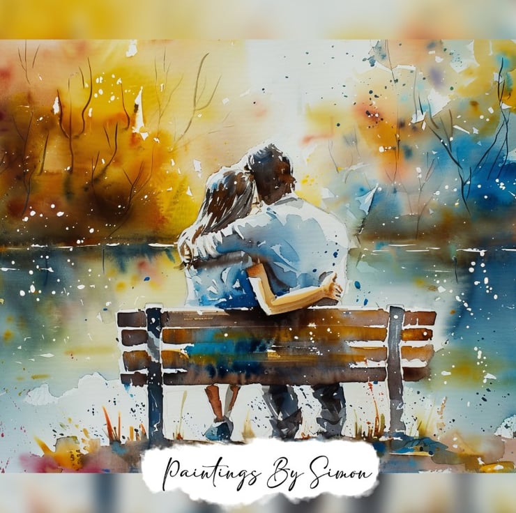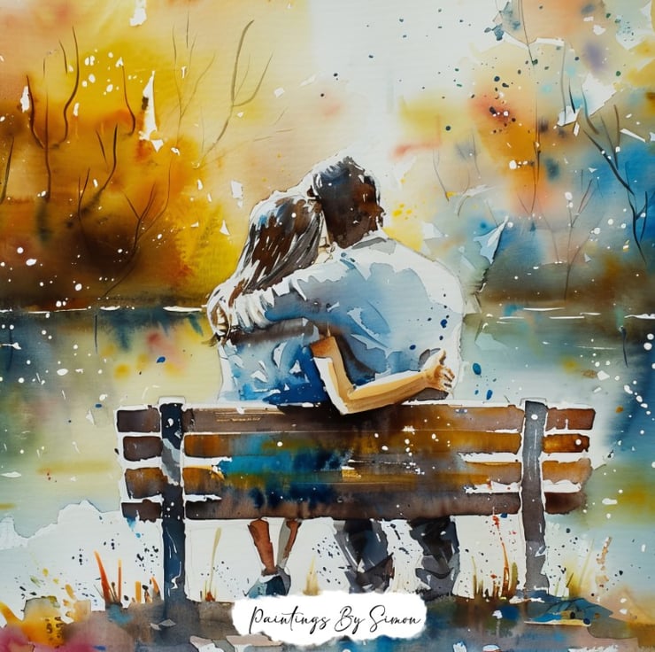 This beautiful watercolor illustration depicts a romantic couple sitting on a bench by a serene lake. Moreover, the couple sits closely, wrapped in a tender embrace, capturing a moment of pure affection and love. The artist’s use of watercolor brings a soft and dreamy quality to the scene, making it feel intimate and serene.