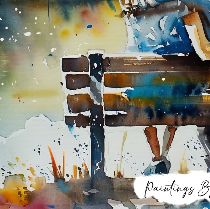 The bench, simple and wooden, anchors the scene, providing a focal point for the couple’s embrace. Additionally, the artist’s attention to detail is evident in the fine lines and textures, enhancing the overall realism of the piece. The subtle splashes of color around the couple further add a touch of whimsy and magic, making the scene feel even more enchanting.