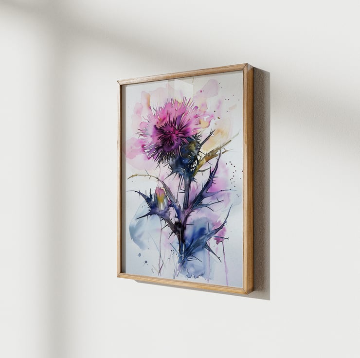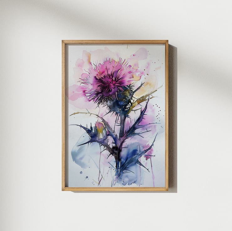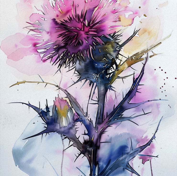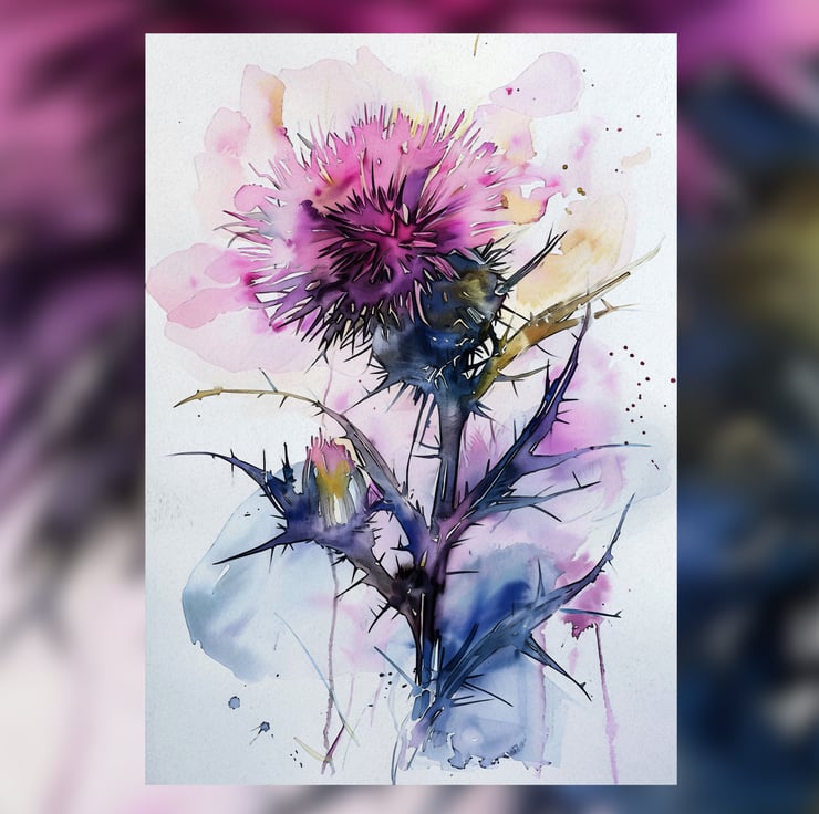 The thistle’s central bloom is depicted in rich, saturated purples and pinks. With hints of yellow and green at the base, adding a touch of natural realism. Additionally, the stems and leaves are painted in deep blues and greens, with fine, spiky details that capture the plant’s rugged texture. The use of light and shadow also adds to the overall realism, giving the illustration a lifelike quality.