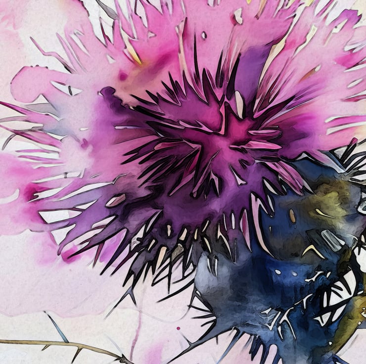 The artist has skillfully used a combination of precise lines and gentle washes to highlight the intricate details of the thistle. Furthermore, the sharp, needle-like petals are contrasted with the soft, flowing background, creating a dynamic and visually striking composition. The interplay of colors adds depth and dimension, making the flower appear almost three-dimensional.