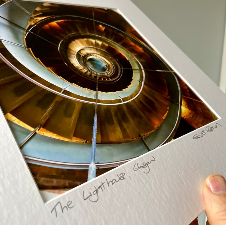 A signed mounted print of the spiral staircase in the Lighthouse building in Glasgow.