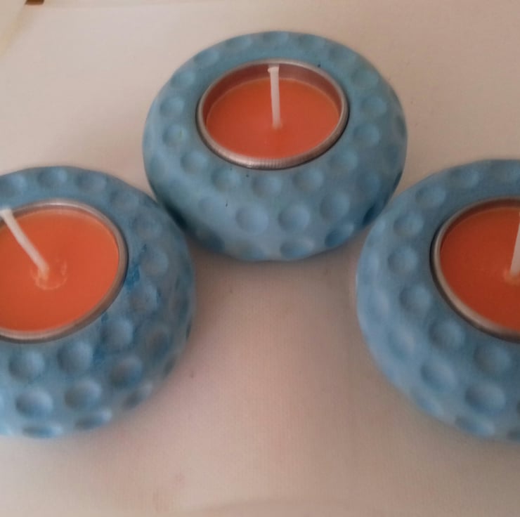 aquacast jesmonite three round candle holders light blue in colour complete with a set of coioured tea lights of your choice
