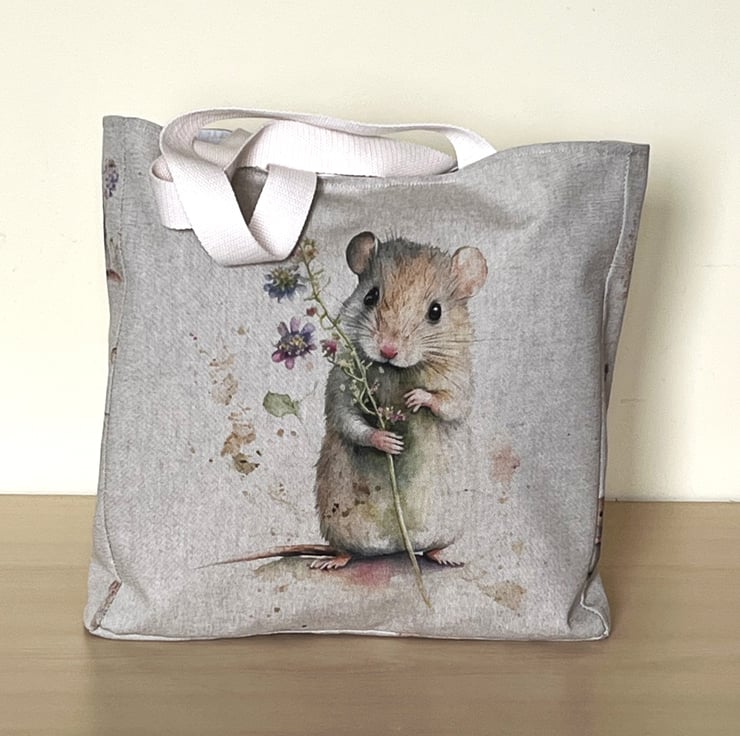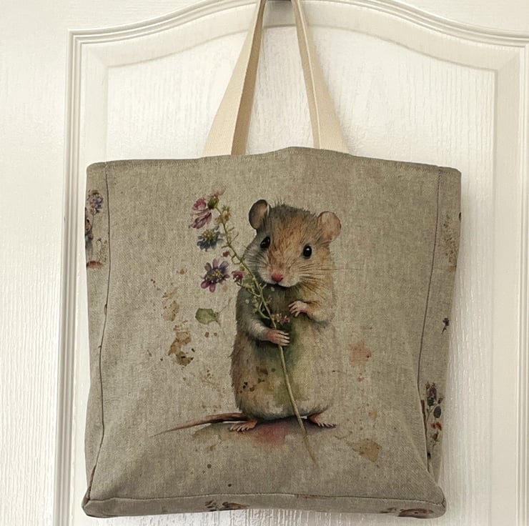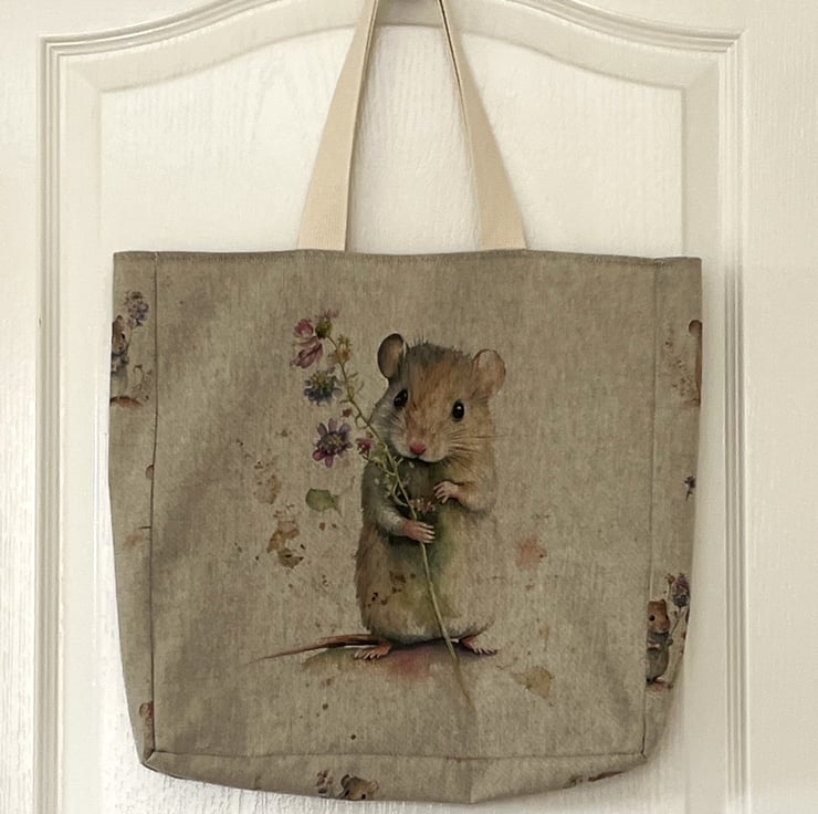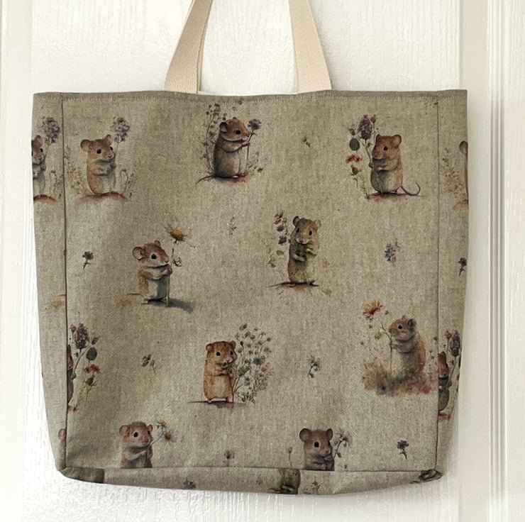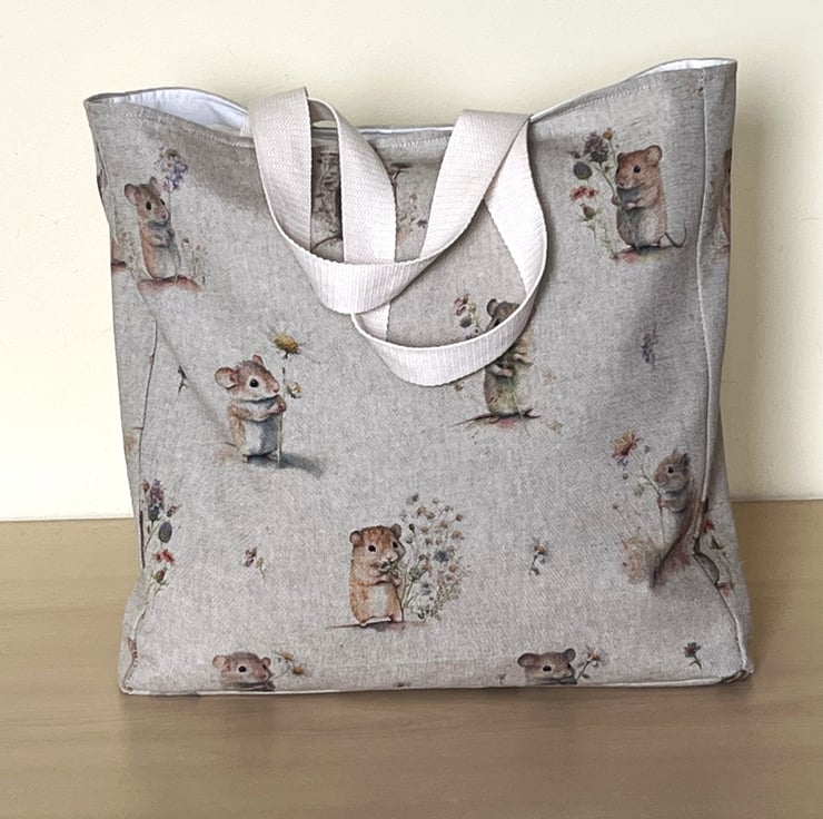 This handmade tote style shopper bag featuring a cute field mouse image has a soft side finish which means that it can be easily folded away when not being used or tucked away in your handbag and always be at hand when you need it.