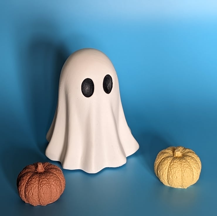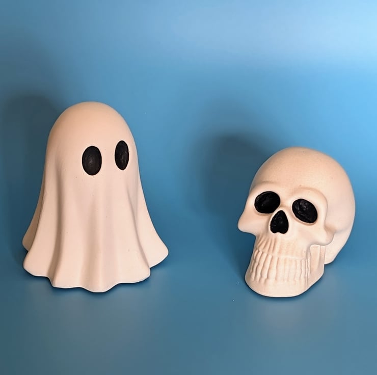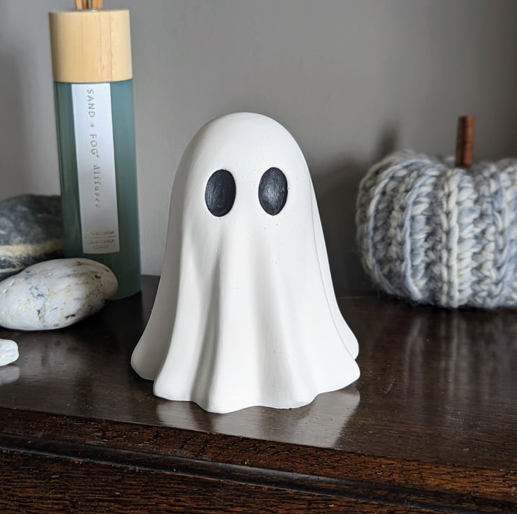 Our ghost ornaments are made from white jesmonite with hand-painted black eyes. They come with cork feet to protect your surfaces from scratches and scuff marks.