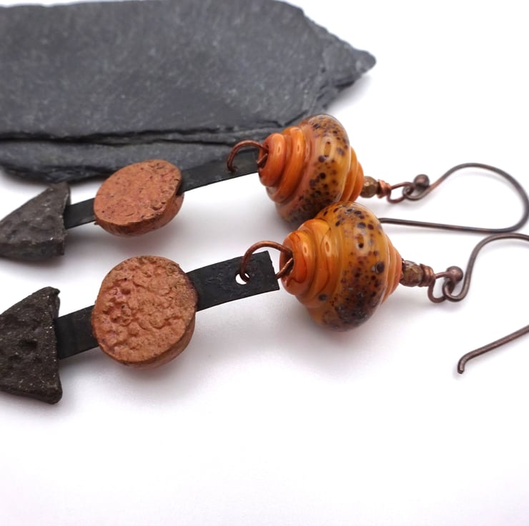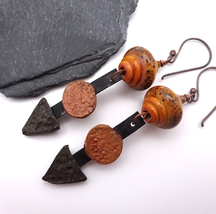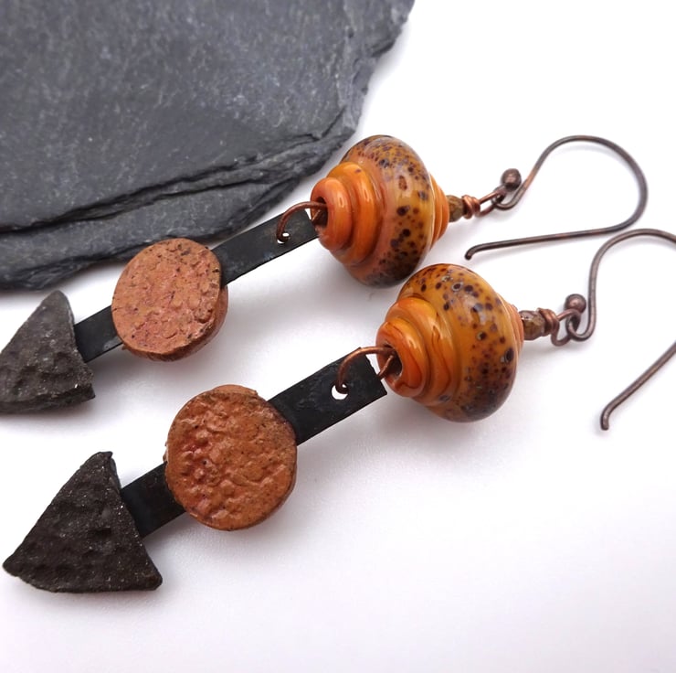 A pair of earrings made with handmade copper ear wires, handmade lampwork brown glass beads and handmade ceramic arrow charms.
