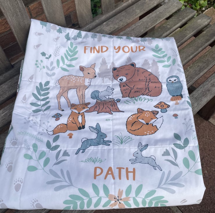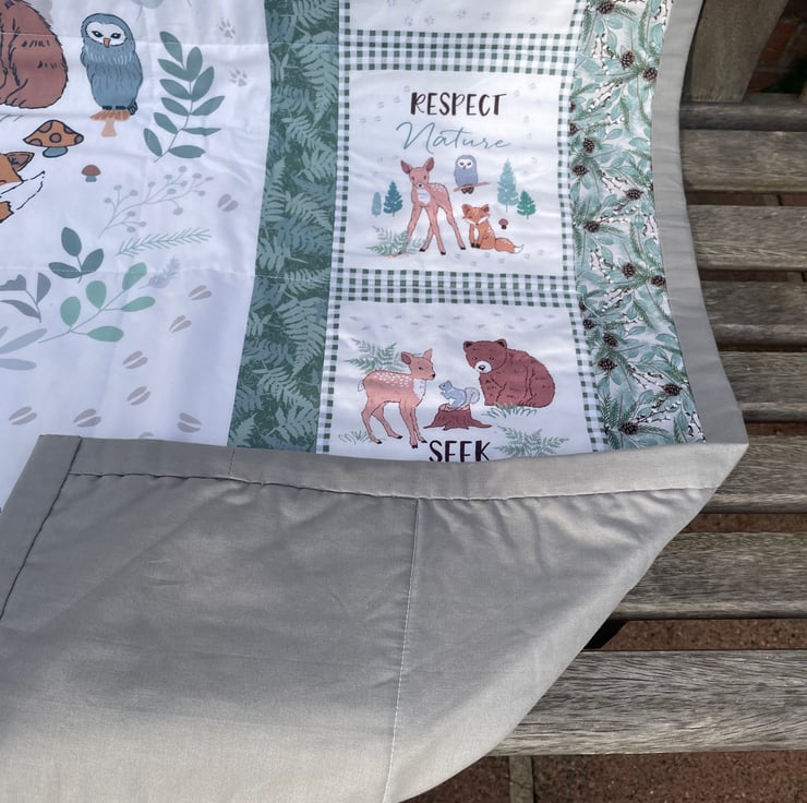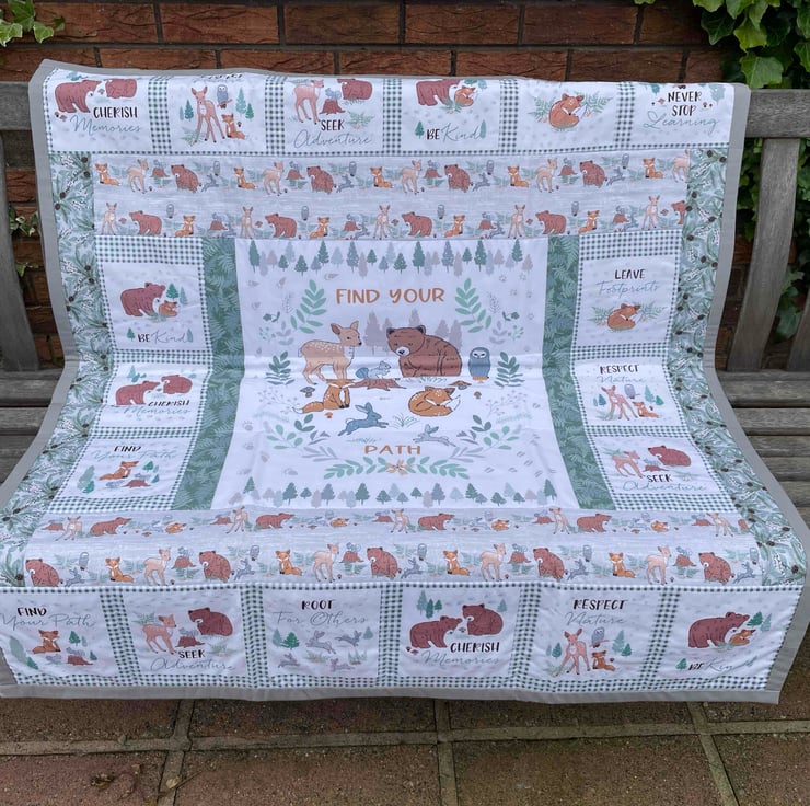 A beautiful handmade patchwork quilt or throw made from the studio e Find your Path fabric collection. Features a central panel with a collection of forest friends and surrounded by patchwork squares with cute quotations. Perfect for nursery or child’s room as toddler quilt, throw or Wallhanging. Measurements are 44 x 48 ins.