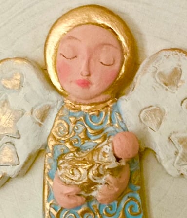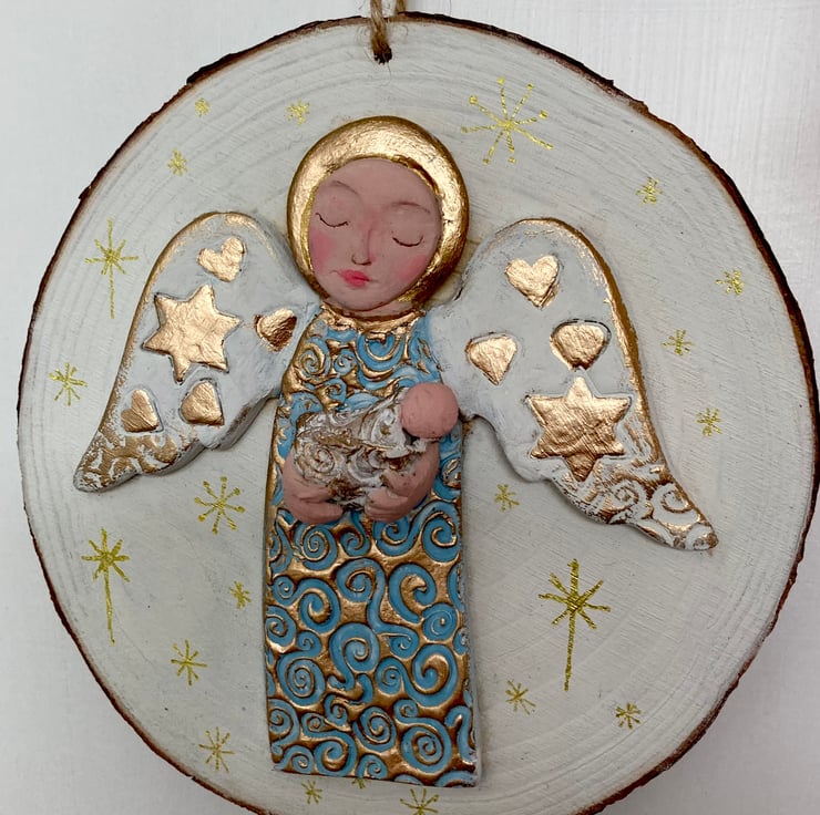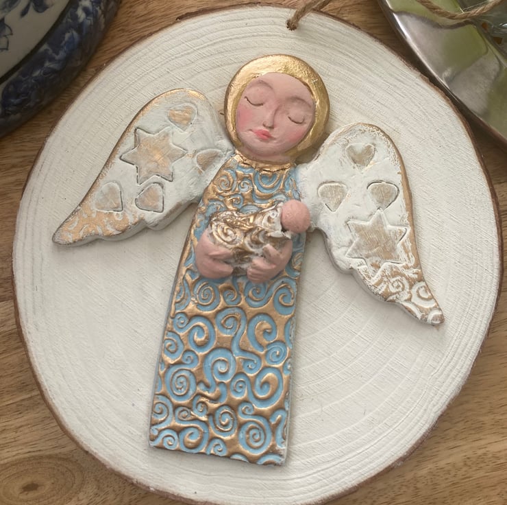 The Angels dress is embossed with a lovely swirl pattern, painted in a light turquoise blue and highlighted with gold. Her white wings are impressed with stars and hearts and painted gold. The Angel face, wings and baby's are also painted with artist quality acrylic paints with a matt finish. The gold highlights have a metallic finish.