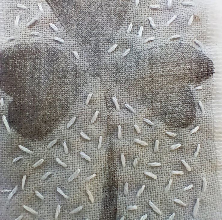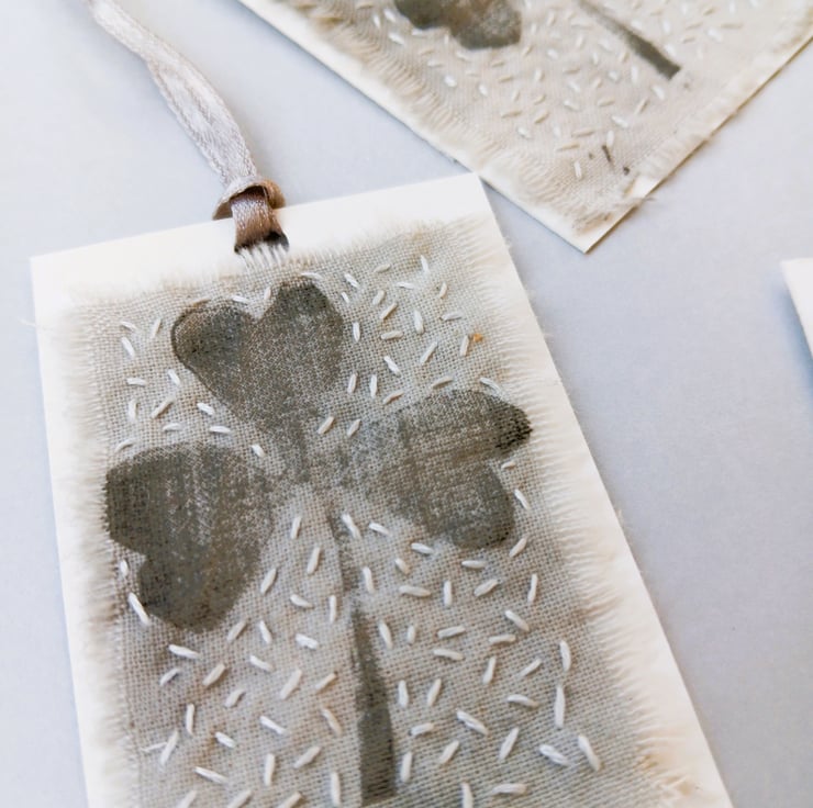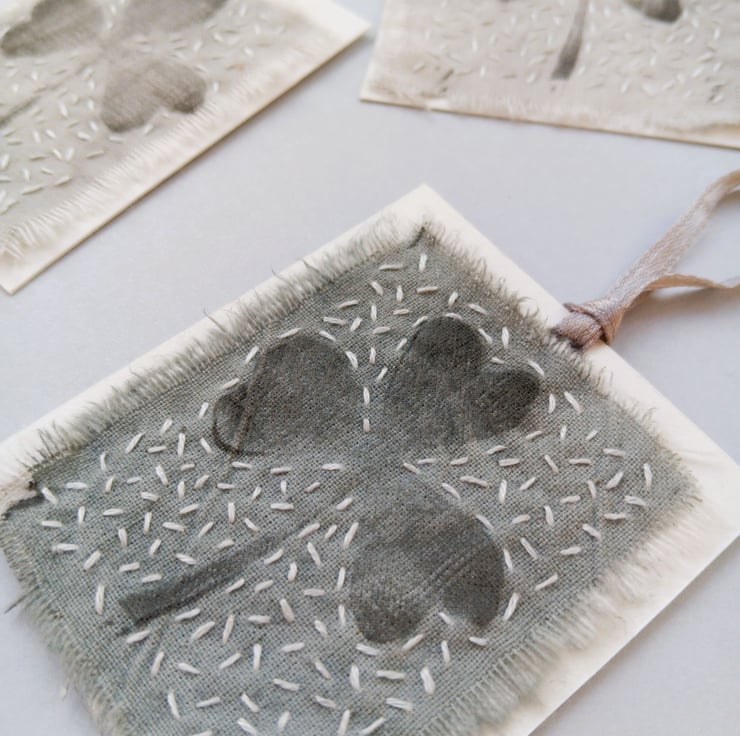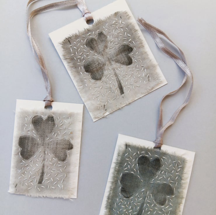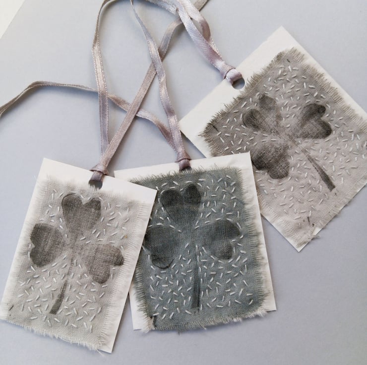 Set of three gift tags featuring my own unique clover leaf lino cut print designs embellished with hand embroidered stitches. Each one slightly different and unique to the other.