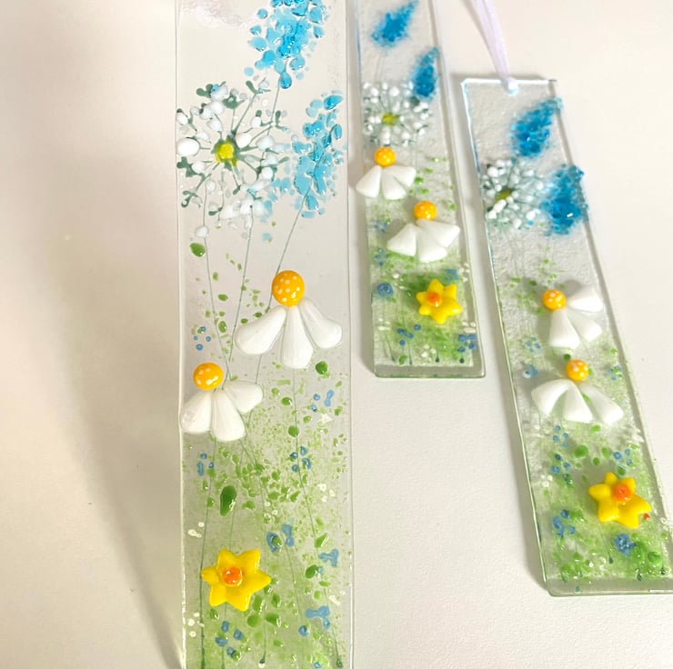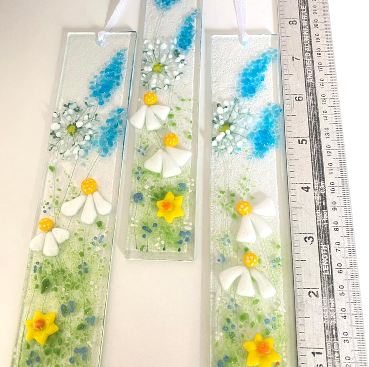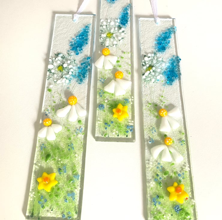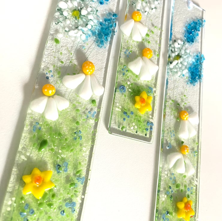 Pretty wild daisy, dandelion and fox gloves .in fused glass which look pretty on a wall or a window . Fused glass art adds light and interest to any room .