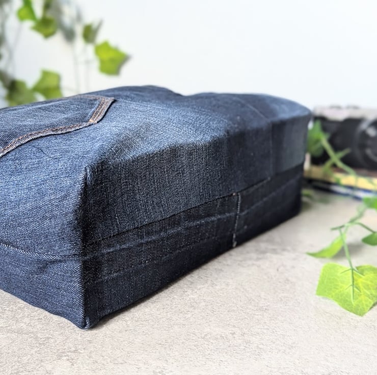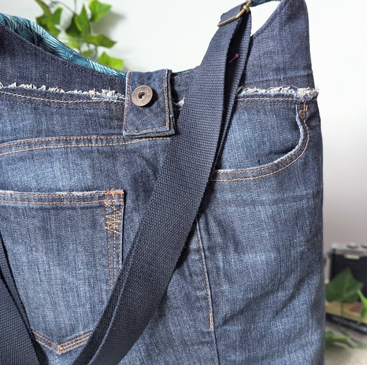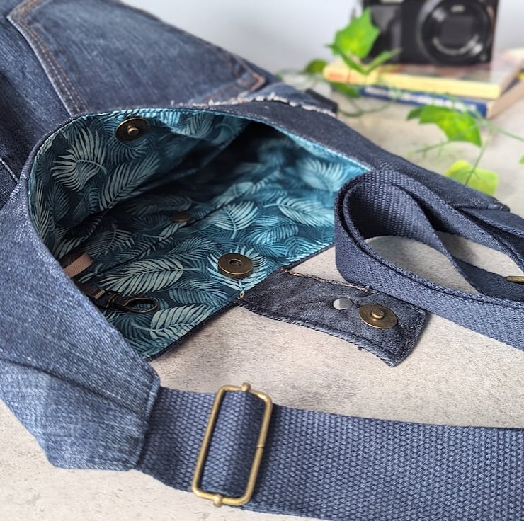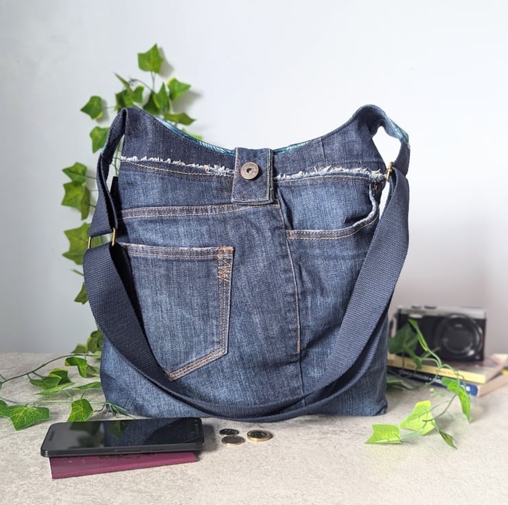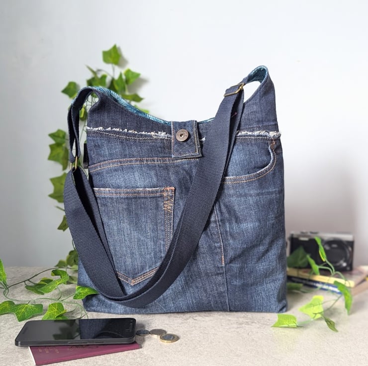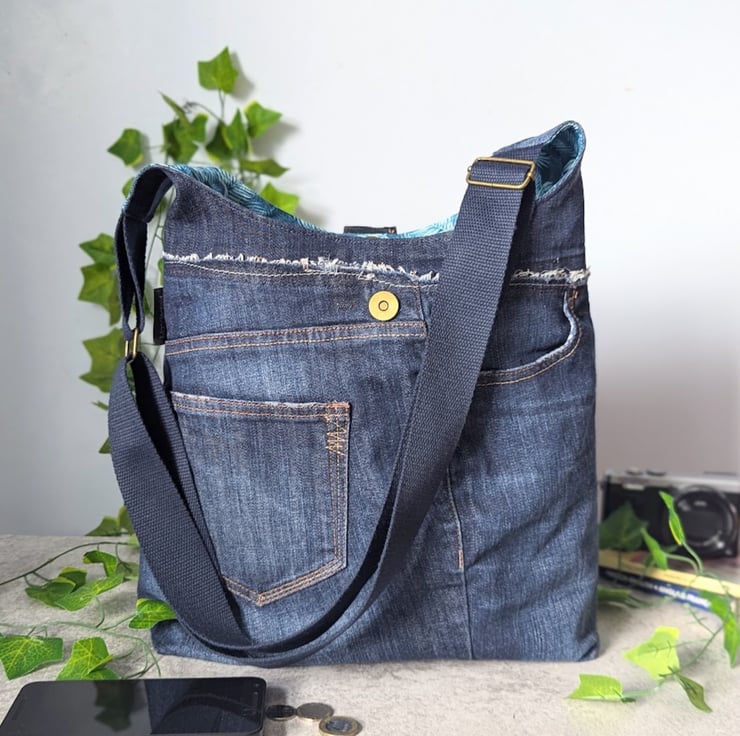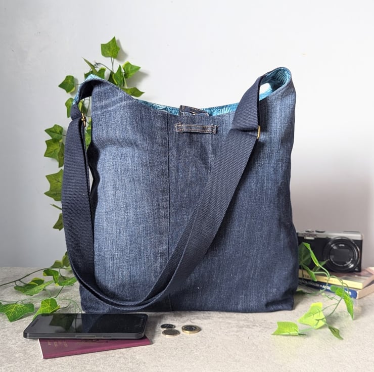 Repurposed denim bucket bag has been handmade using sections of repurposed worn denim jeans and lined with a teal and blue feather leaf design lining. A navy blue adjustable shoulder or cross body strap strap fits comfortably over the shoulder. Choose length of strap (shoulder or cross body) from drop down menu.