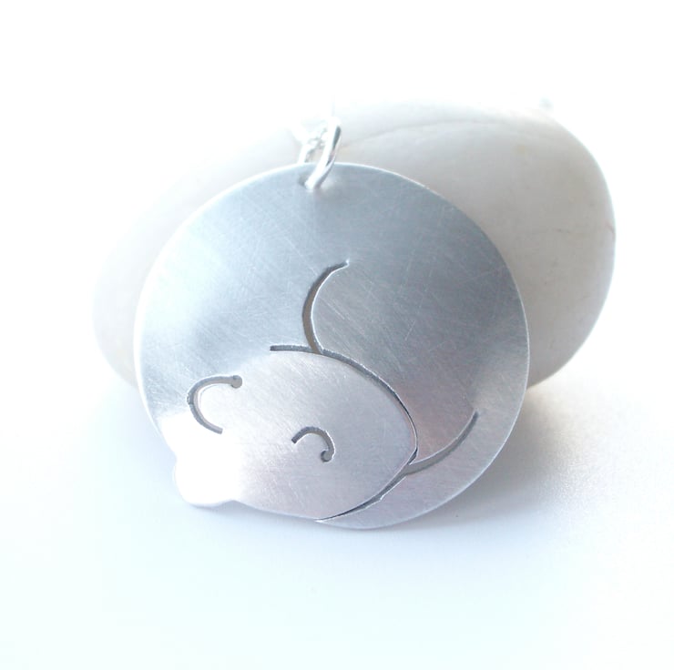 This mouse necklace is made from sheet aluminium. I have hand cut the mouse design using a piercing saw and domed the design to achieve a more curled up look. Finally, I have filed the edges and brushed the aluminium to give a matt look.
