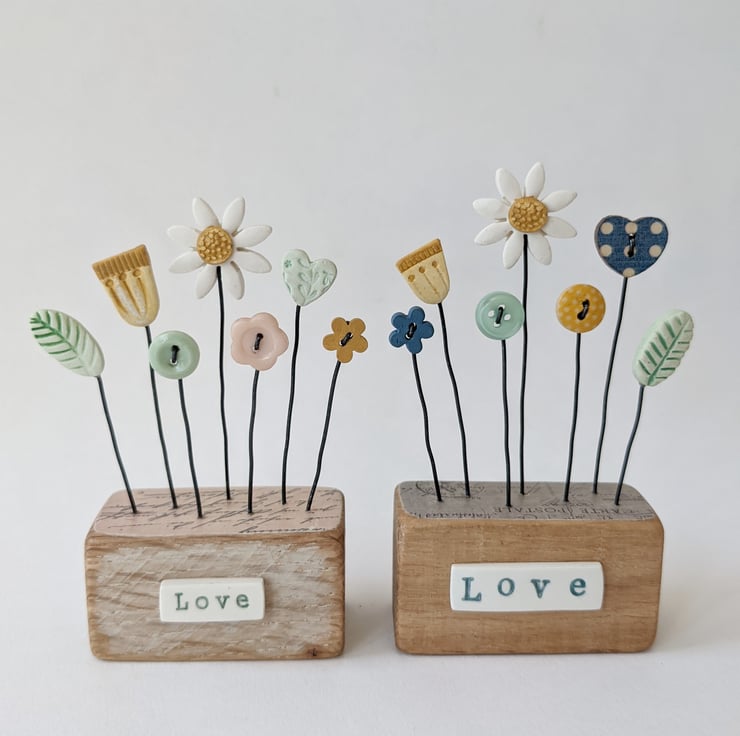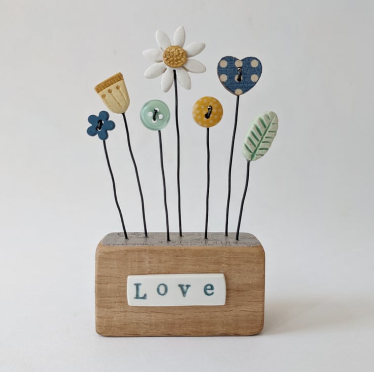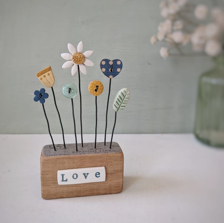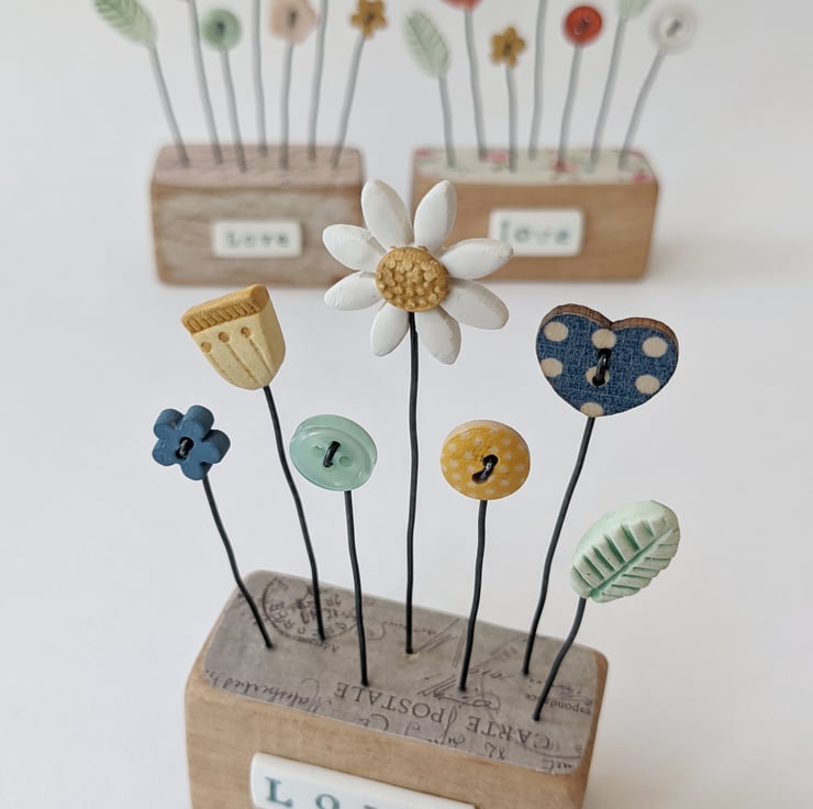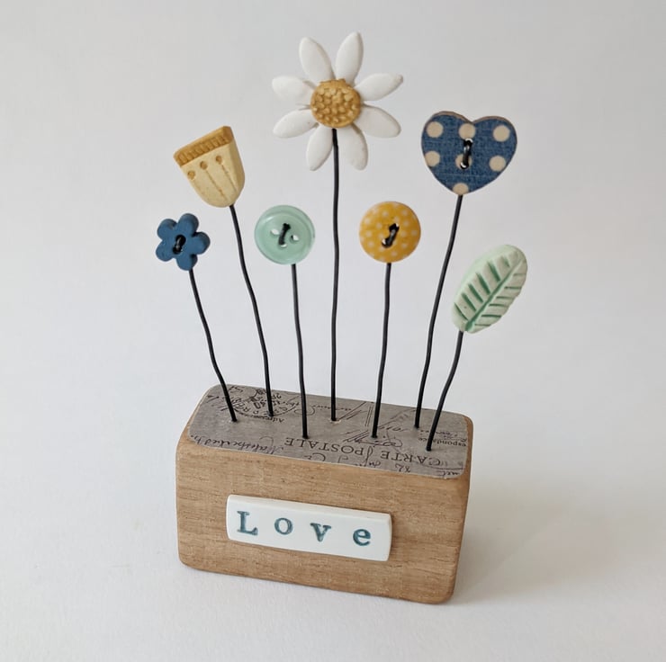 Clay and button flowers grow in this little garden. They stand on their wire stalks in a painted and decoupaged wooden block with little clay stamped words on the front.