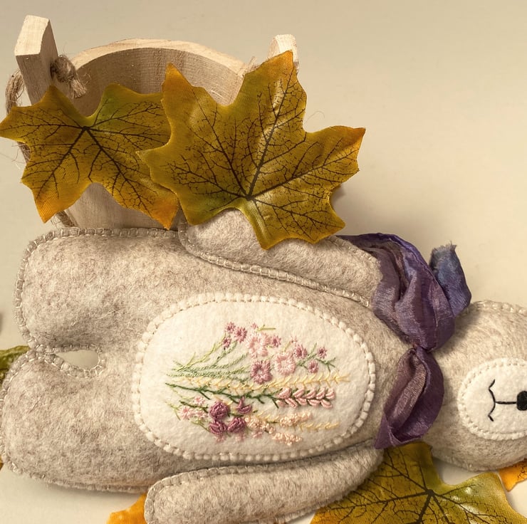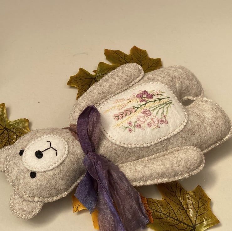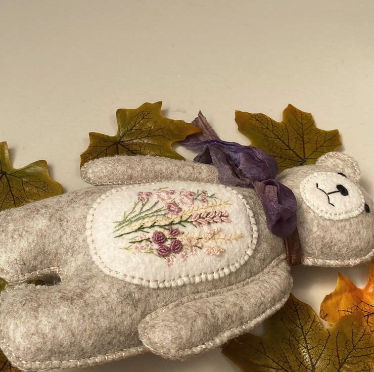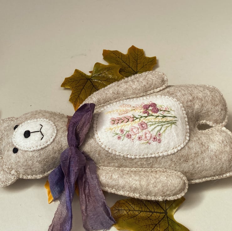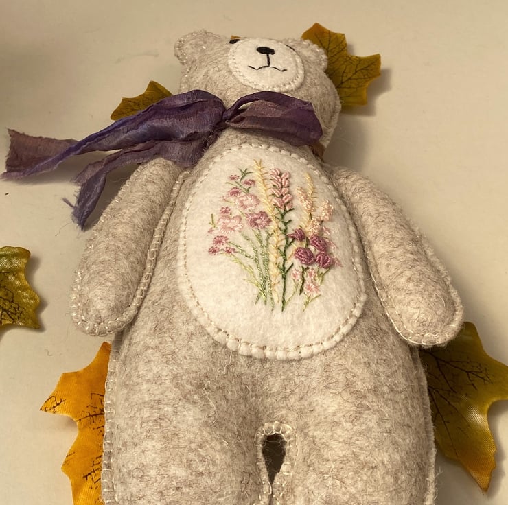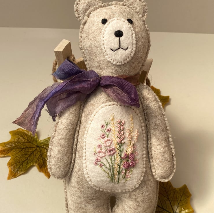 Part of the woodland collection of felt animals, in scandi style, Mr bear was handmade from 100% premium wool felt in natural beige. His body front is in a contrast snow wool felt with decorative hand embroidery. A delicate bouquet of flowers hand embroidered in various pale pinks with a touch of pale yellow.