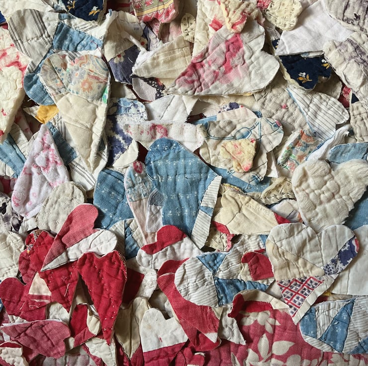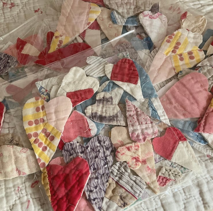 A collection of quilt hearts, hand cut in a variety of shapes and sizes. All created from antique or vintage quilt, and vintage patchwork quilt. There is also one small piece of quilt included.