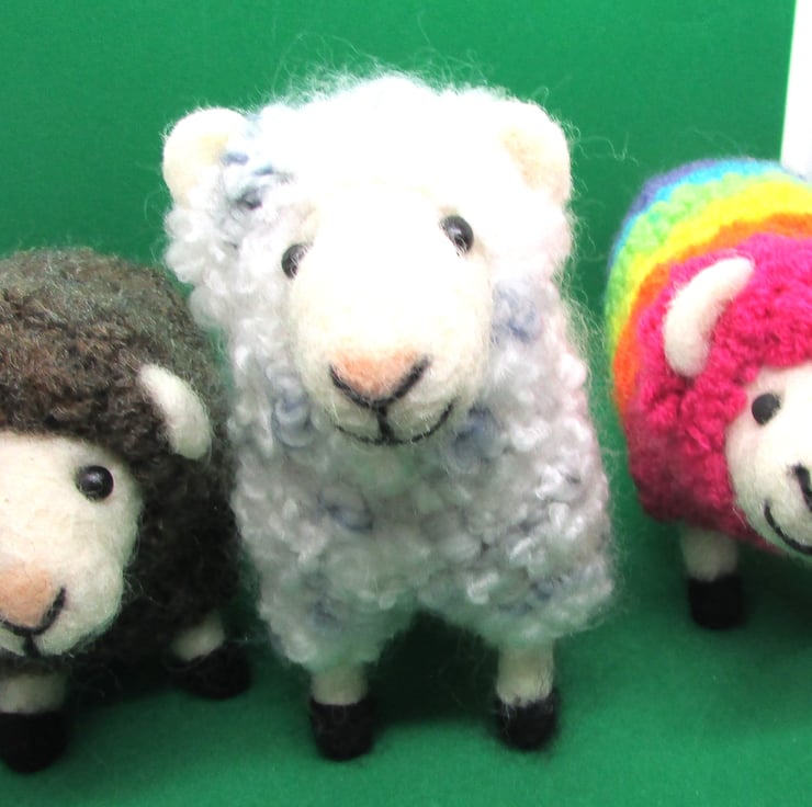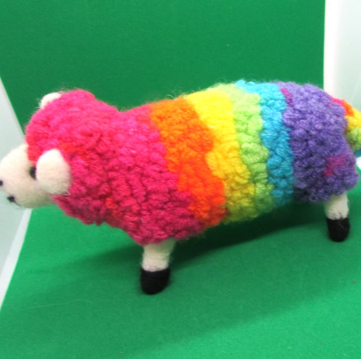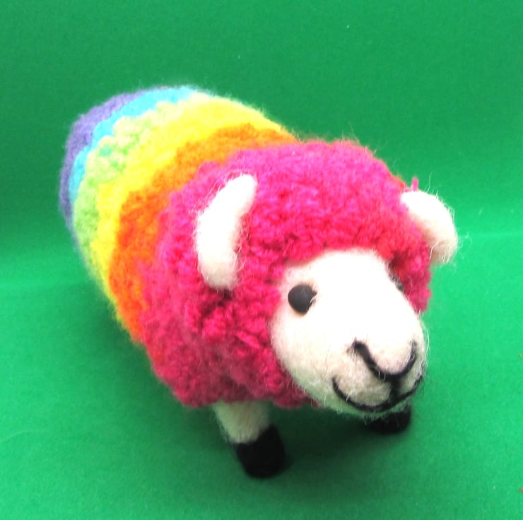 an adorable lovingly handmade needle felted very rare, rainbow LGBTQ Pride Rainbow sheep figure. is the perfect gift for someone and would look lovely on display in any home. so quite big and has a very cute face with eyes.