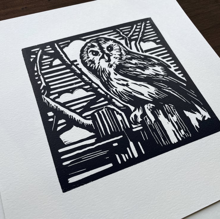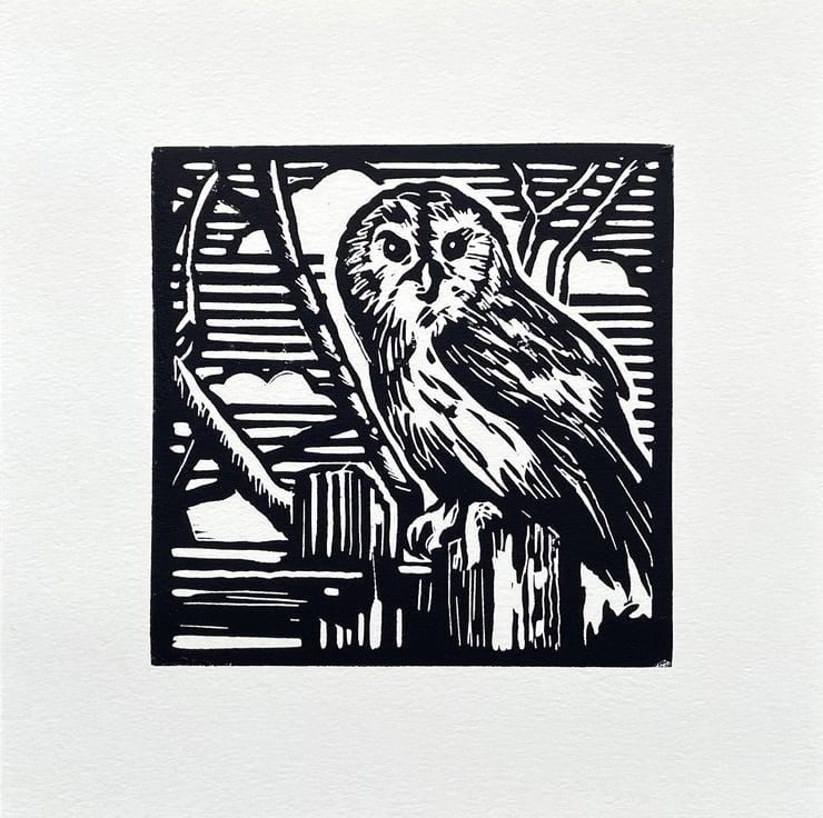 'Tawny Owl' is an original linocut print on quality ivory coloured paper using black printing ink.