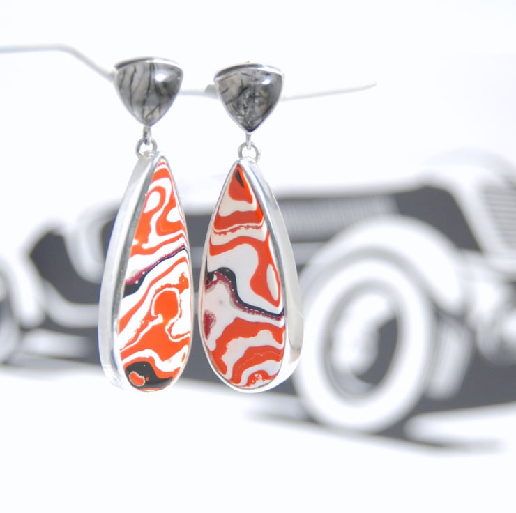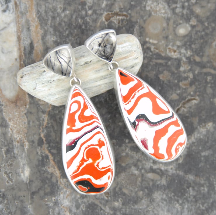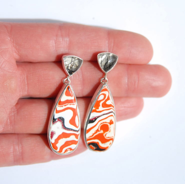 These statement earrings have have drops of bright fordite bezel set in sterling silver hanging beneath triangular pieces of tourmalinated quartz which hide the post and scroll fittings. The fordite is predominantly a wavey pattern of cream and orange with a little black and red (someone compared it to koi carp colours), the patterns don't match but the drops were cut from the same piece of rough so they work as a pair. Tourmalinated quartz is clear quartz which black needles of tourmaline have grown inside it, an unusual pairing but I think that it highlights the black in the fordite. They measure approx 51mm by 17mm but fordite is surprisingly lightweight so they would be comfortable to wear all day. Comes in a gift box.