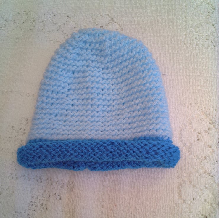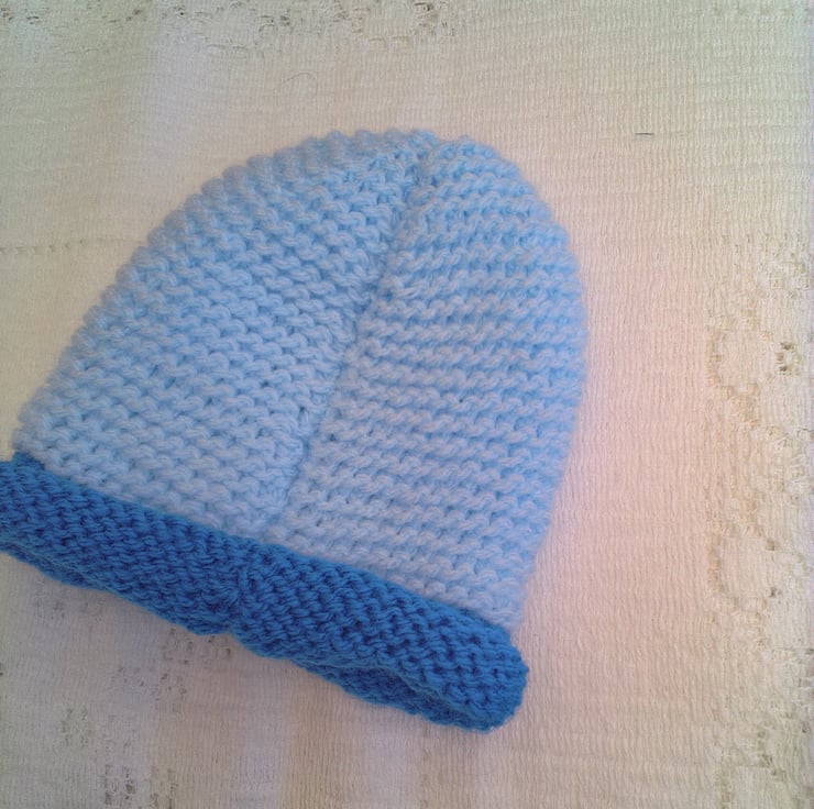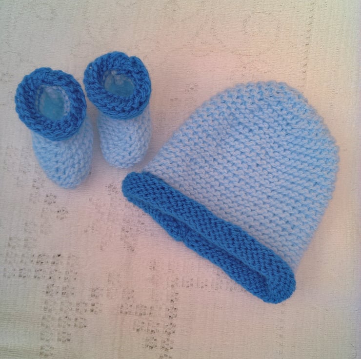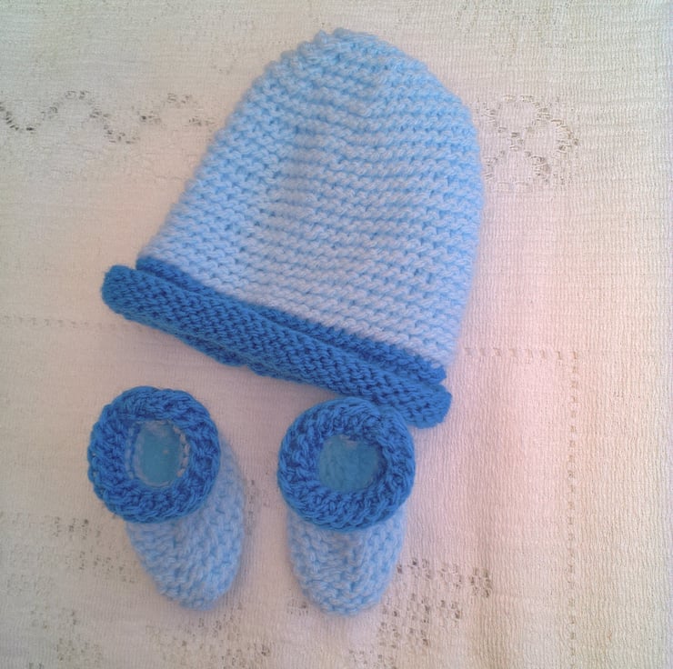 Hand knitted hat set for babies, including a beanie hat and a pair of booties. The set would make an ideal gift for a birthday, baby shower or for a new baby or to keep your little ones warm on a chilly day.