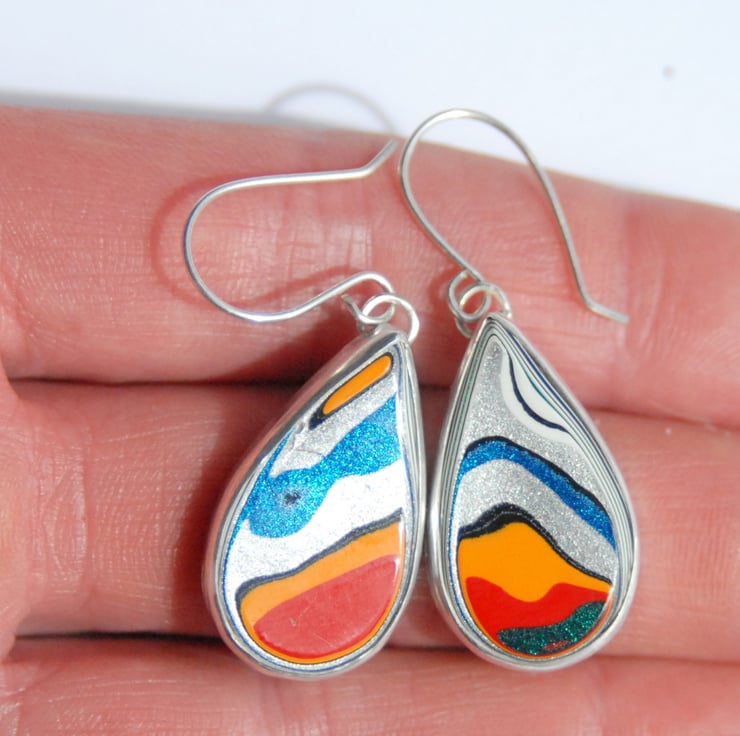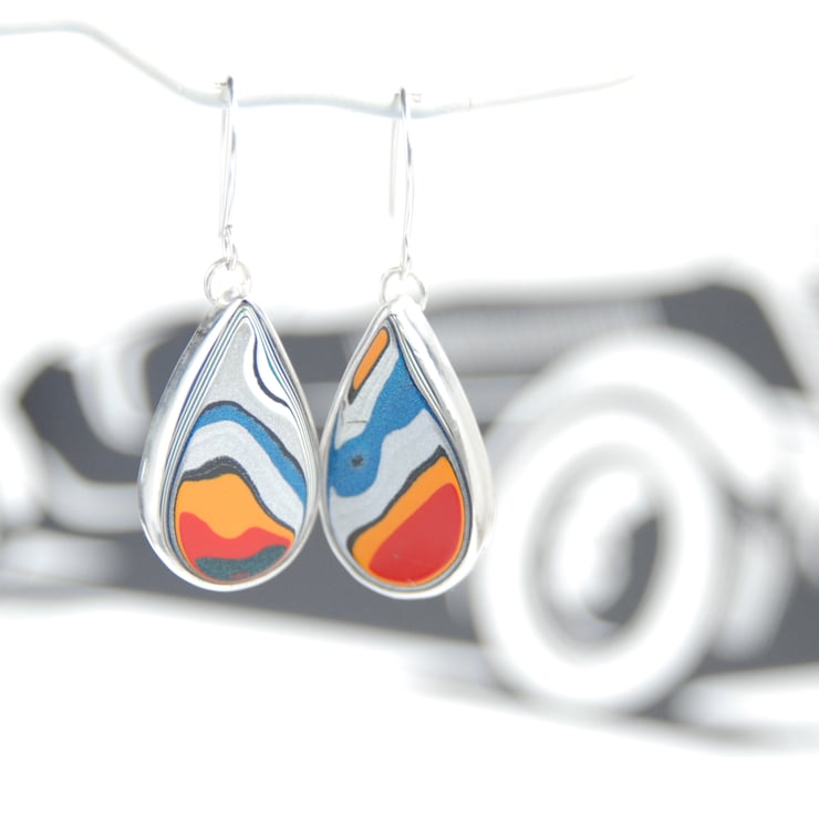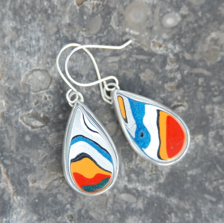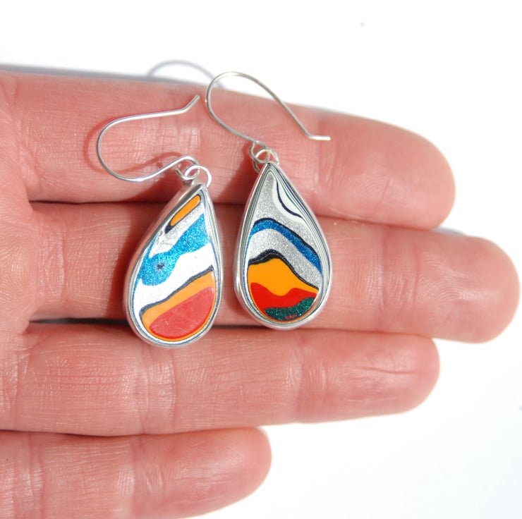 These sparkly drop earrings feature teardrops of fordite bezel set in sterling silver finished with simple sterling silver hooks. The fordite has a bold pattern of broad stripes in red, orange, sparkly silver and blue. They are a sister pair - the patterns don't match but the colour palette does so they make sense as a pair. They measure 44mm (from top of hook) by 16mm across, fordite is lightweight so comfortable to wear all day.