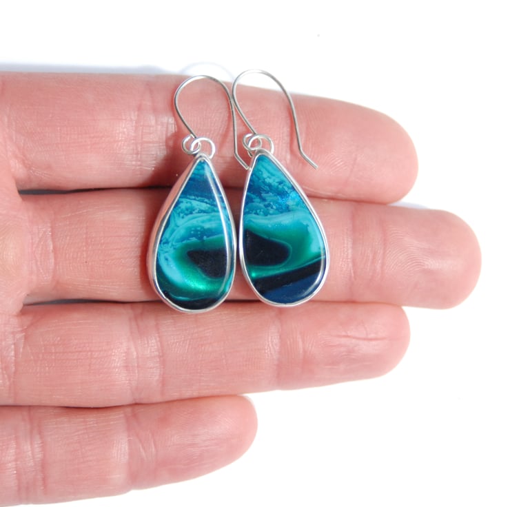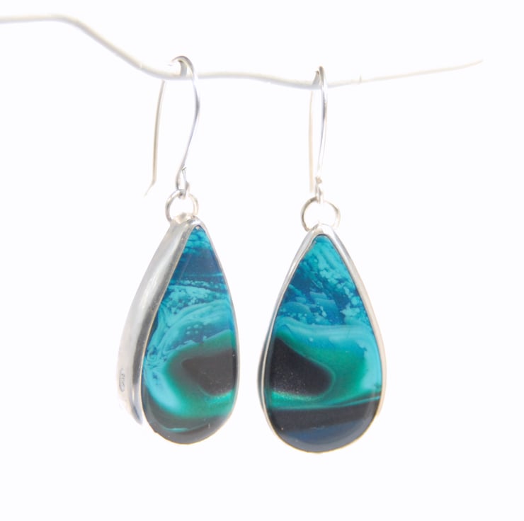 These classic drop earrings are given a dramatic twist by featuring sustainable bowlerite bezel set in recycled sterling silver. The bowlerite has a swirly pattern of emerald green, teal and turquoise around a black dot (it reminds me of the tropical seas and jungle around cenotes if you've ever been to Central America). The emerald and teal are shimmery when the light catches them. The earrings measure approx 44mm drop (inc hooks) by 16mm, bowlerite is light weight so these would be comfortable to wear all day and into the night. Comes in a gift box.