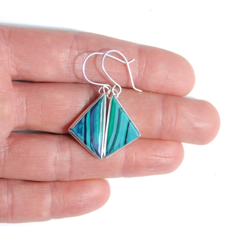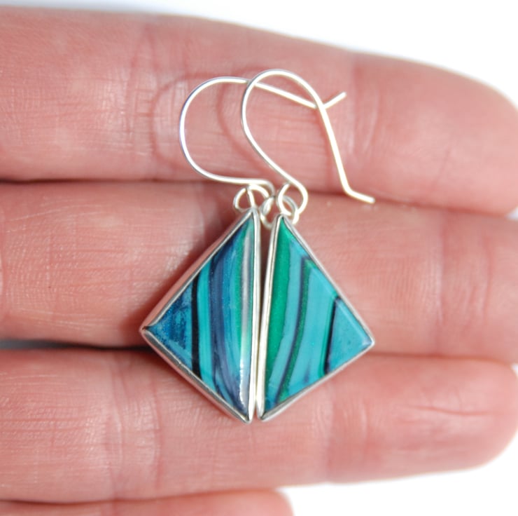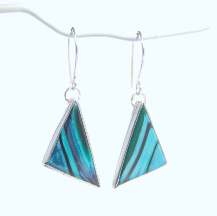 These dinky drop earrings are given a twist by featuring triangles of sustainable bowlerite bezel set in recycled sterling silver. The bowlerite is predominantly turquoise with streaks of emerald and dark blue, the emerald has a shimmer to it. The earrings measure approx 41mm drop (inc hooks) by 13mm, bowlerite is light weight so these would be comfortable to wear all day and into the night. Comes in a gift box.