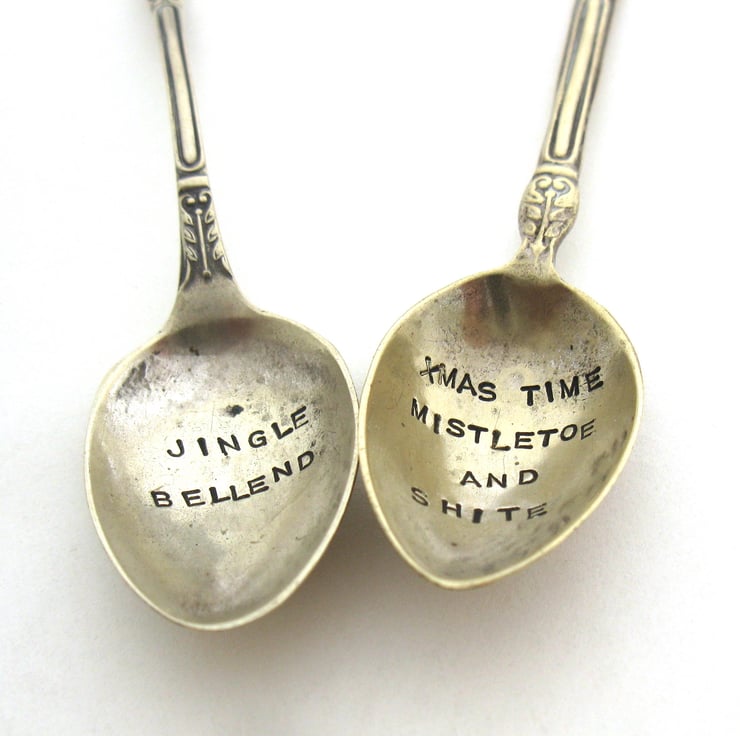 A pair of battered old apostle spoons (those ones with the grumpy-looking little robed figure on the end of the handle) stamped with the very rude messages JINGLE B-LLEND and XMAS TIME, MISTLETOE AND SH-TE. Ideal for secret santas, people you detest, or anyone you know who is a bit 'bah, humbug' about the whole festive goodwill thing.