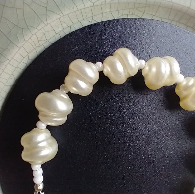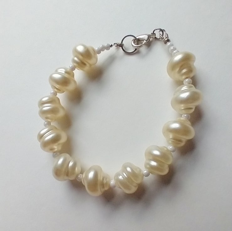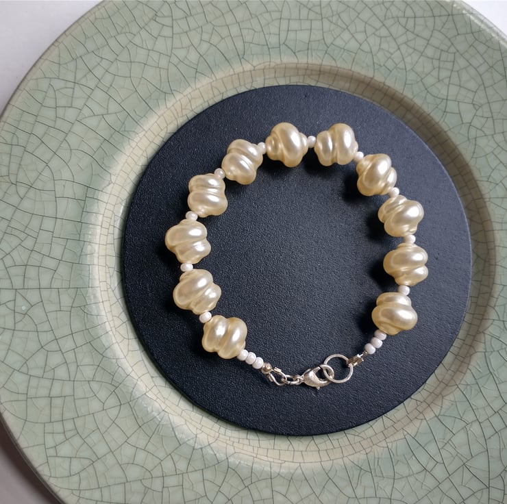 Unusual twisted faux pearl bead bracelet. Simple and elegant, will compliment any outfit. Upcycled faux pearl beads and glass seed beads.