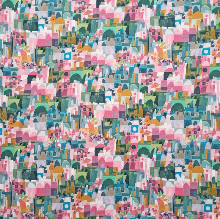 The Liberty Urban Jungle print is inspired by the late illustrator and picture book creator, Brian Wildsmith and features a cityscape with lots of colourful buildings.