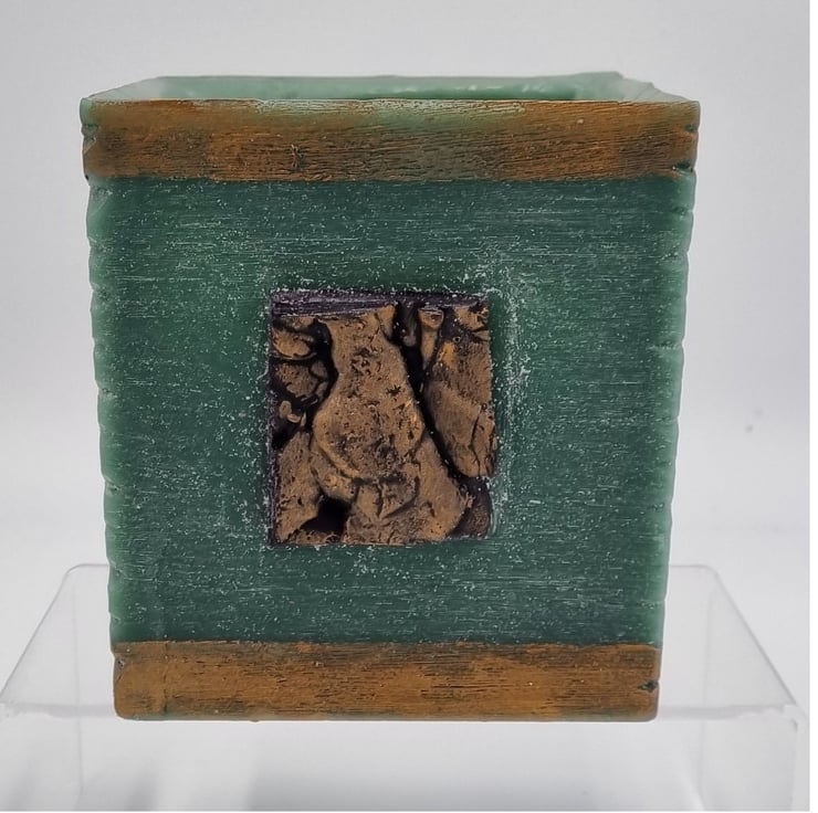 A square plant pot holder made from green wax and finished with an antique gold effect design..The container can also be used for any storage purpose for example craft tools, pens and pencils. The container is 13 cm high with a width and depth of 12 cm.