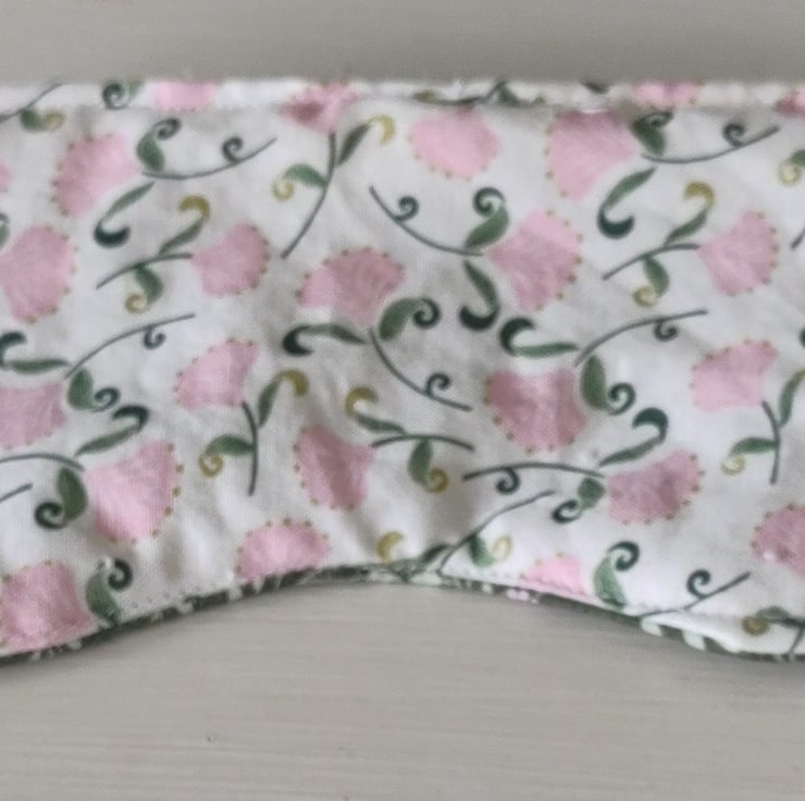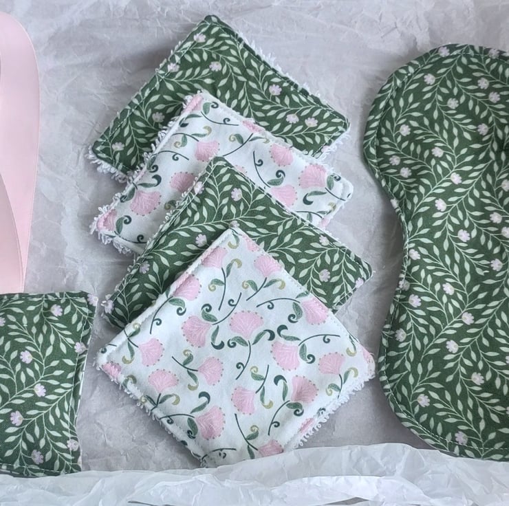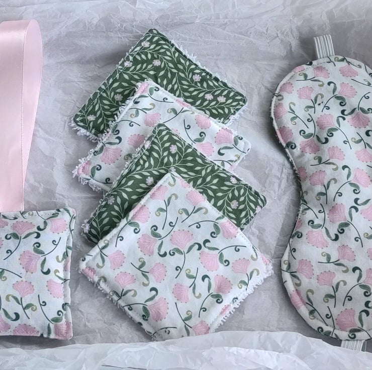 First we have a reversible eye mask. Next we have a matching, reversible lavender sachet with complementary coloured ribbon. Finally we have 4 matching reusable cotton and Terry Toweling make up wipes.