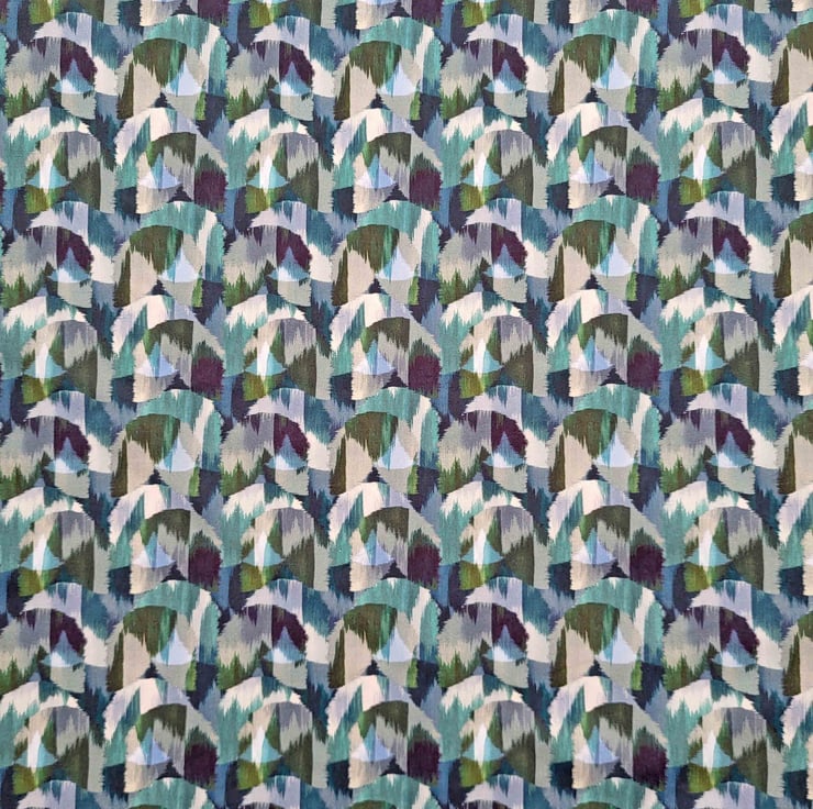 The Liberty Ikat Night print is inspired by the ikat style patterns and markings found in variegated tulips. Geometric shapes were painted with large brushstrokes to create the appearance of an ikat weave.