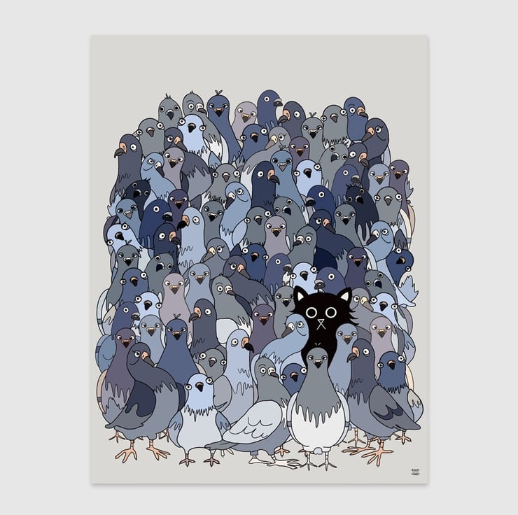 Step into a whimsical world where feline mischief meets avian chaos with our delightful wall art print, "Cat Among The Pigeons." In this hand-illustrated wall art print, our mischievous black cat has cleverly hidden itself amidst a bustling flock, or kit, of pigeons. As you gaze upon the print, you'll discover a captivating array of expressions adorning each feathered friend. Some pigeons appear bewildered, their beady eyes widened in surprise, while others boast mischievous grins, as if conspiring with their furry infiltrator, and some just look simply confused! The scene brims with playful energy, showcasing the timeless game of cat and bird, where curiosity triumphs over fear. Let this amusing print adorn your walls and bring a smile to your face as you marvel at the cleverness of our feline friend and the expressive personalities of the pigeons. "Cat Among The Pigeons" is a charming reminder that even in the midst of chaos, there's always room for a little whimsy.