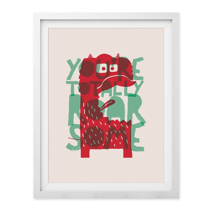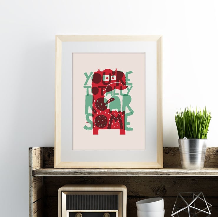 "You're Totally Roarsome" is a charming A4 print that is perfect for families with little (or big) monsters in their lives. This playful typographic print is sure to bring a smile to your face, and is a fun way to express your appreciation for the unique and special individuals in your life. Whether you are looking for a playful accent for your home or a thoughtful gift for a friend or loved one, this "You're Totally Roarsome" print is sure to be a hit. Its bright colours and playful design are sure to brighten up any room and will provide a daily reminder of just how special and loved your monsters are.