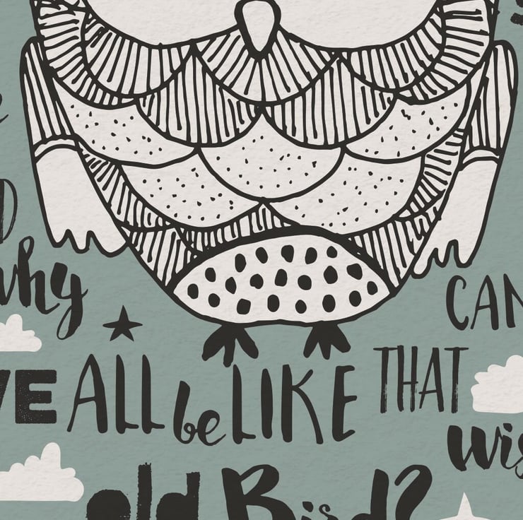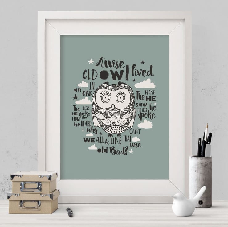 This charming A4 print features a fun hand-drawn owl, perched amongst the words of the classic poem, 'A Wise Old Owl.'