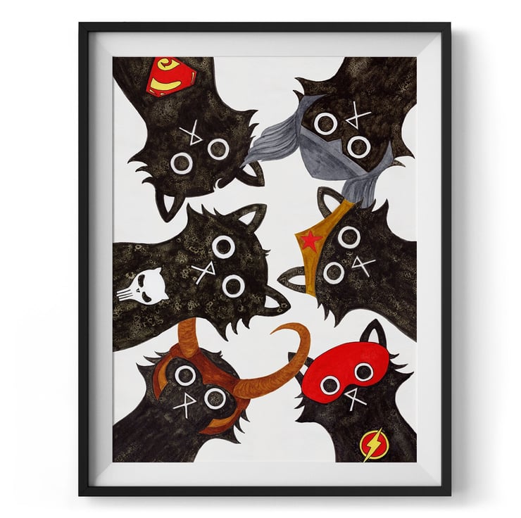 This print features both DC and Marvel inspired black cats. Thor, Loki, The Punisher, The Flash, Wonder and Super Cat are all making their presence known.