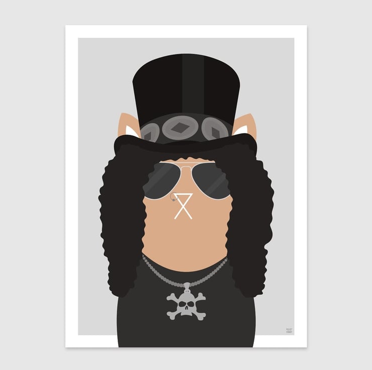 This A4 cat version of Slash from Guns N' Roses is the purrfect blend of cool and cute! This black cat is rockin' a stylish top hat, sunglasses, and a skull and cross bones necklace. But what really sets this feline apart is its long, flowing hair, just like the legendary guitar player. The cat is also wearing a classic black t-shirt, giving it that classic rock n' roll vibe. The giclee print captures all the details, making this picture a must-have for any cat and Guns N' Roses fan. Whether you're a die-hard fan of the band or just appreciate a good illustration of a cool cat, this print is sure to bring a smile to your face. So, go ahead and add it to your collection today!