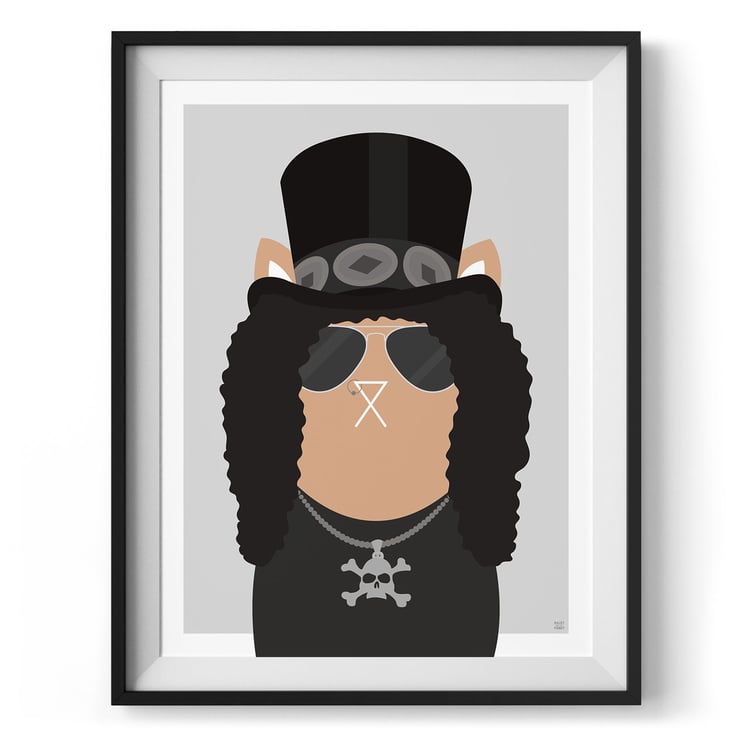 This A4 cat version of Slash from Guns N' Roses is the purrfect blend of cool and cute! This black cat is rockin' a stylish top hat, sunglasses, and a skull and cross bones necklace. But what really sets this feline apart is its long, flowing hair, just like the legendary guitar player. The cat is also wearing a classic black t-shirt, giving it that classic rock n' roll vibe. The giclee print captures all the details, making this picture a must-have for any cat and Guns N' Roses fan. Whether you're a die-hard fan of the band or just appreciate a good illustration of a cool cat, this print is sure to bring a smile to your face. So, go ahead and add it to your collection today!