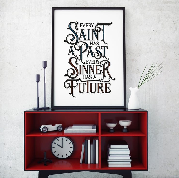 "Saint & Sinner" is an A4 wall art print that features a typographical design with a powerful message. The print showcases the words "Every Saint Has A Past. Every Sinner Has A Future" in a decorative black font, with highlights of cyan and orange red that add a pop of colour and depth to the design. The background is kept simple and elegant, with a pure white canvas that allows the font to stand out and be the focal point of the piece. This print is not only visually stunning but also thought-provoking, reminding us of the complexity of human nature and the idea that everyone has the potential to change and grow. Whether displayed in a home, office, or any other space, "Saint & Sinner" is sure to make a statement and spark conversation. It is a timeless work of art that will add sophistication and elegance to any decor.