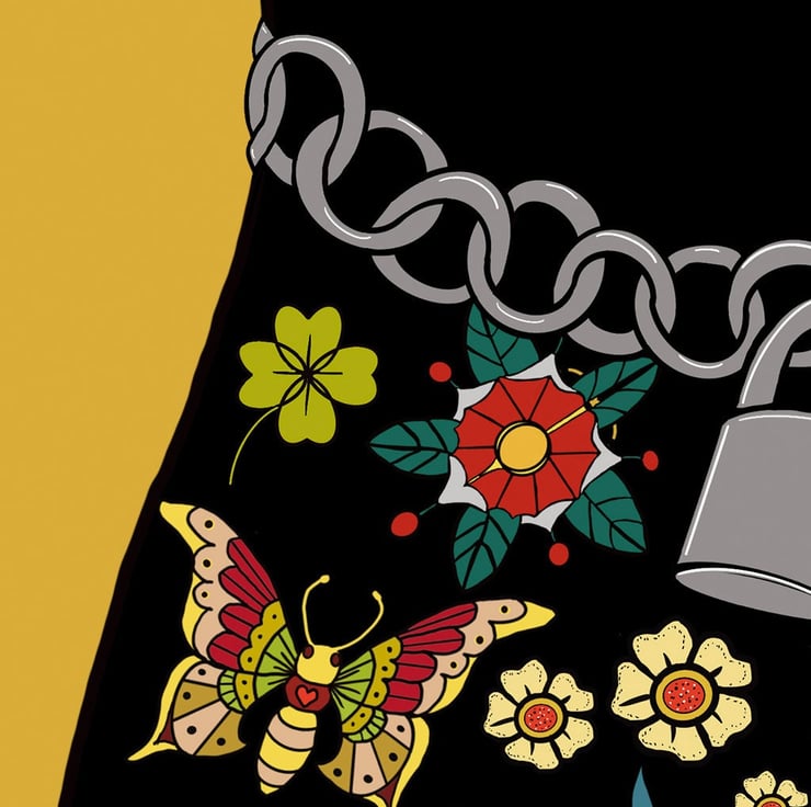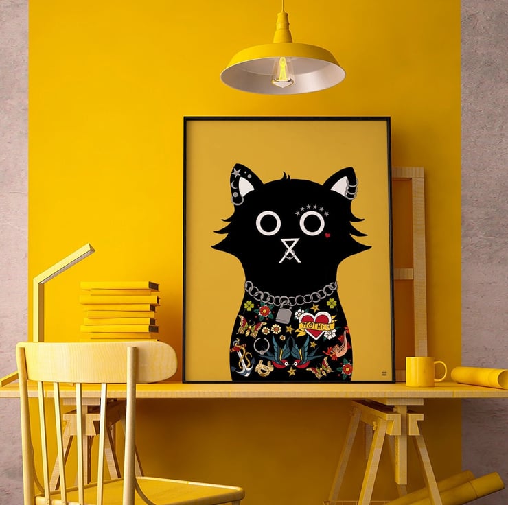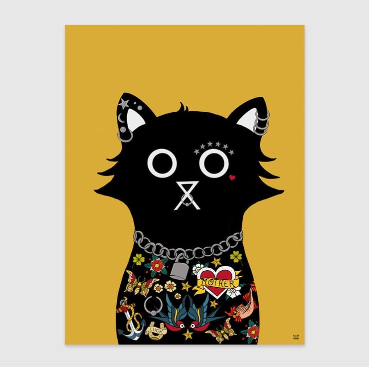 This print of a black cat with its chest covered in Jerry style tattoos is a work of art that captures the essence of the rebellious spirit. Inspired by Sid Vicious, the cat has nose, ear, and eyebrow piercings, giving it an edgy, punk look. The black feline is also wearing the famous padlock chain around its neck, adding to its bold, daring appearance. The background of the print is a mustard yellow colour that brings out the intricate details of the tattoos and piercings. The black cat's expression is one of defiance, as if it's daring anyone to mess with it. The combination of the tattoos, piercings, chain, and background creates a visually stunning image that is sure to be the centre of attention in any room. This punk-inspired print design makes it a perfect piece for those who embrace their individuality and reject the status quo. Sid Cat is truly a work of art for the rebel at heart.