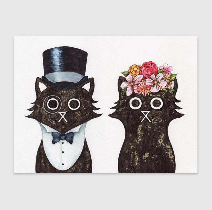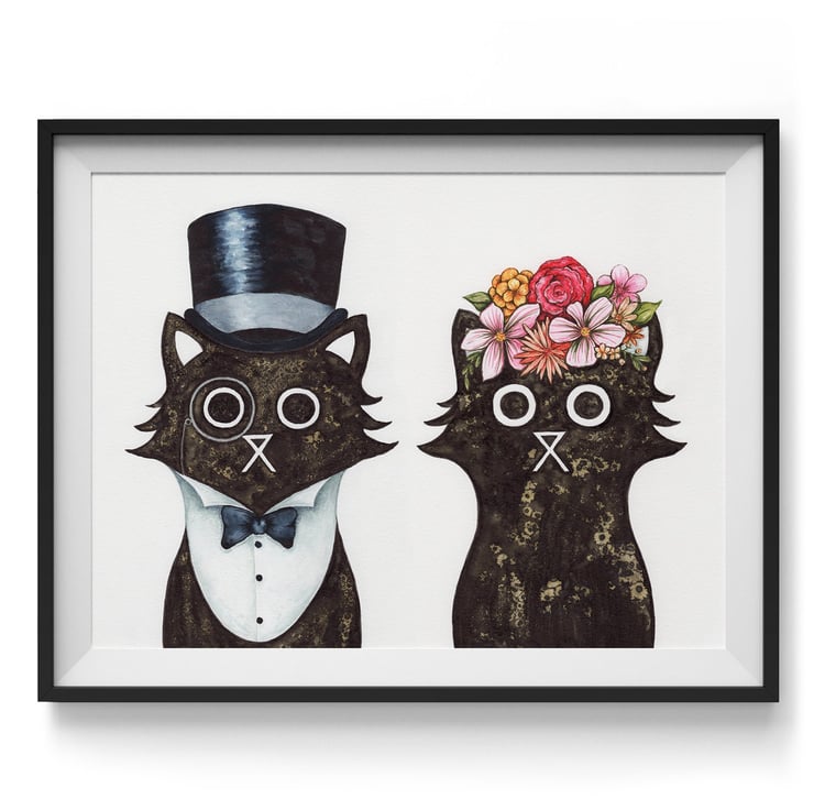 Lord and Lady Cat is a beautiful A4 print that features a pair of illustrated black cats. These cats are hand drawn and painted with great care and attention to detail. One cat is wearing a beautiful headpiece of flowers and the other cat is dressed in a top hat, monocle and bow tie, giving it a very dapper look. This print would make a great addition to any wall, and its whimsical nature means that it would be suitable for people of all ages. It would also make a wonderful gift for a newly married couple. Whether you're a cat lover or just appreciate beautiful illustrations, Lord and Lady Cat is sure to be a treasured piece in any home.