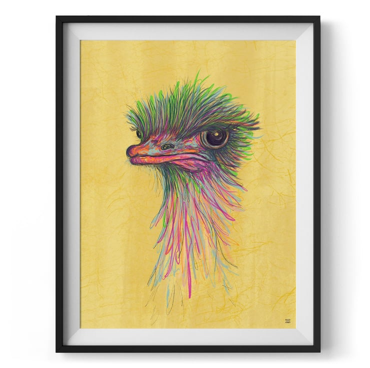 Meet Olive, our playful and vibrant ostrich. Olive is illustrated in a loose, hand-drawn style, with bold splashes of pink, yellow, orange, and green. These vibrant colours give Olive a tropical feel, making her the perfect addition to any bright and cheerful room. Despite her playful appearance, Olive has a slightly serious demeanour, making her the perfect guardian for your home. She is always keeping an eye on everything and ensuring everything is in order. Olive is sure to bring a touch of fun and liveliness to any room. This giclee print is a high-quality reproduction of the original illustration, capturing every detail and nuance of Olive's playful and slightly serious character. So go ahead and add this charming piece of art to your collection today!
