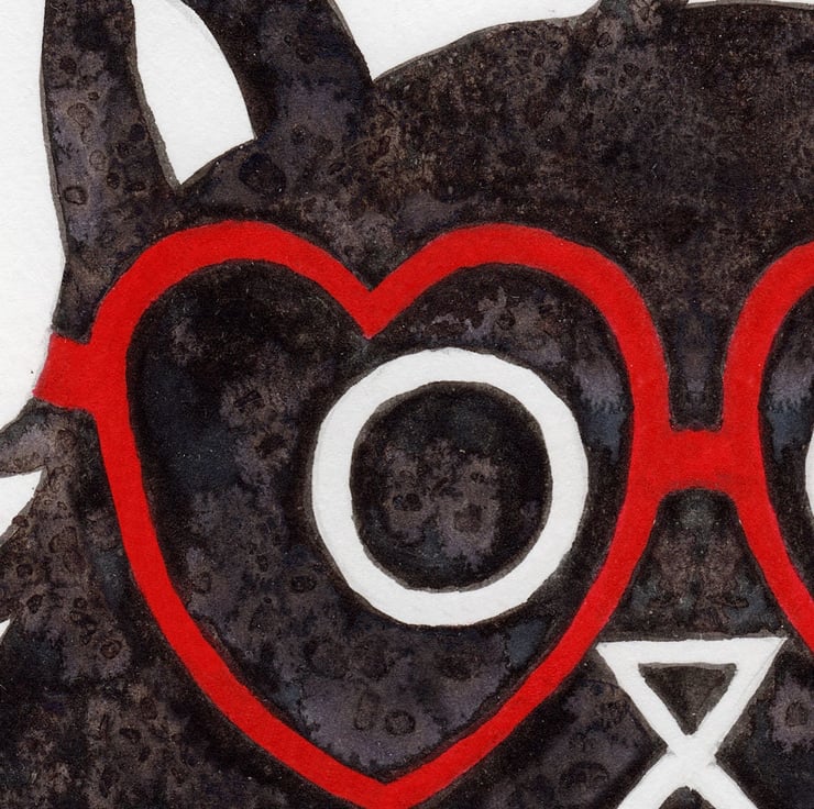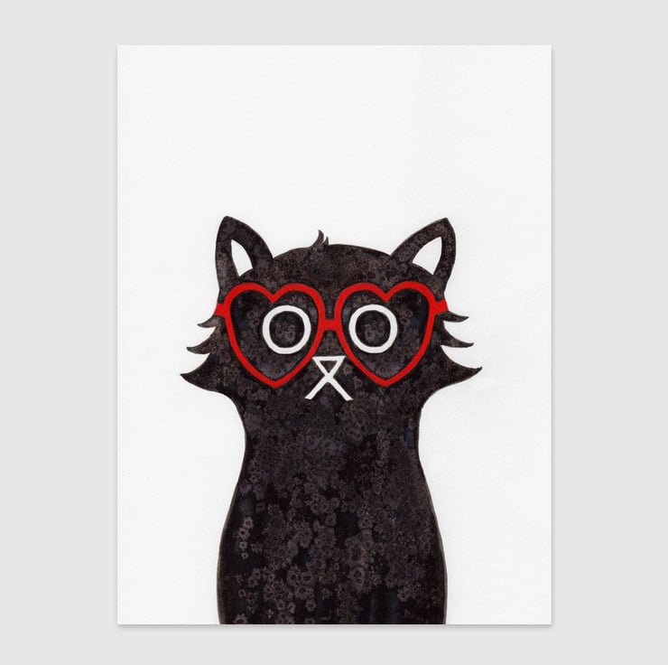 "Heart Specs Cat" is an A4 print that will bring a smile to your face every time you look at it! This hand-illustrated print features a cute black cat wearing a pair of red heart shaped glasses. It's the perfect addition to any cat lover's collection and will make a great conversation starter in any room. The intricate details in the cat's fur and the quirky glasses give the print a fun, whimsical feel.