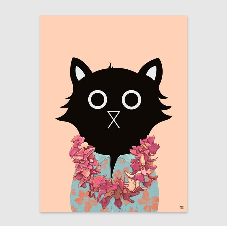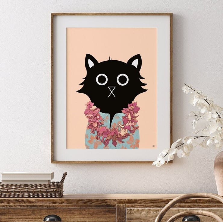 Summer Vibes Cat is a delightful wall art print that captures the essence of the summer season. The A4 print features a black cat, dressed in a floral Hawaiian shirt and a flower lei, looking cool and relaxed. The colourful and playful design of the print evokes a sense of joy and light-heartedness, perfect for bringing some summer vibes into any room. The black cat's eyes are bright and curious, adding a touch of whimsy to the scene. The floral Hawaiian shirt adds a pop of colour and pattern to the print, while the flower lei around the cat's neck adds a touch of tropical charm. This giclee print would be a great addition to any living space, adding a fun and playful touch to your decor. Summer Vibes is a perfect reminder of the carefree days of summer and will brighten up any room with its cheerful energy.