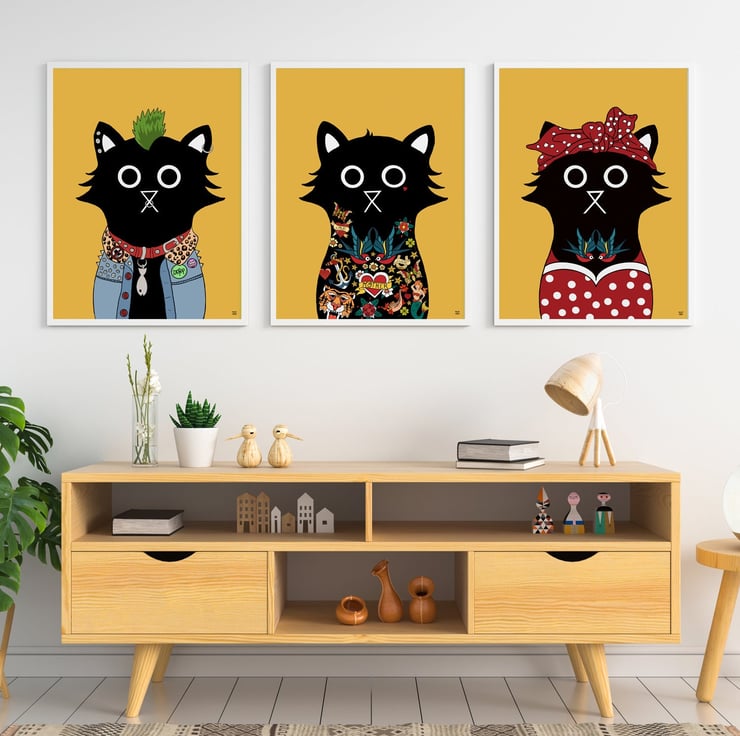 This illustration is part of the "Cats with Tats Collection", which is a series of cat illustrations with unique and colourful tattoos. The combination of the black cat, its tattoos, and the mustard yellow background make this print a fun and quirky piece of art that is sure to brighten up any room.