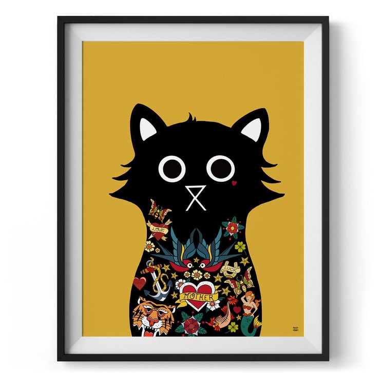 The illustration depicts a sleek black cat with an abundance of Jerry style tattoos. The feline's fur is a rich shade of black, providing a stark contrast against the vibrant mustard yellow background. The tattoos on the cat include classic swallows, hearts, a tiger, mermaid, carp and an anchor. The intricate designs of each tattoo show the influence of traditional Americana tattoo art, with bold lines and an eye-catching colour palette. The print captures every detail of the illustration, from the black cat's piercing eyes to the intricate details of each tattoo.
