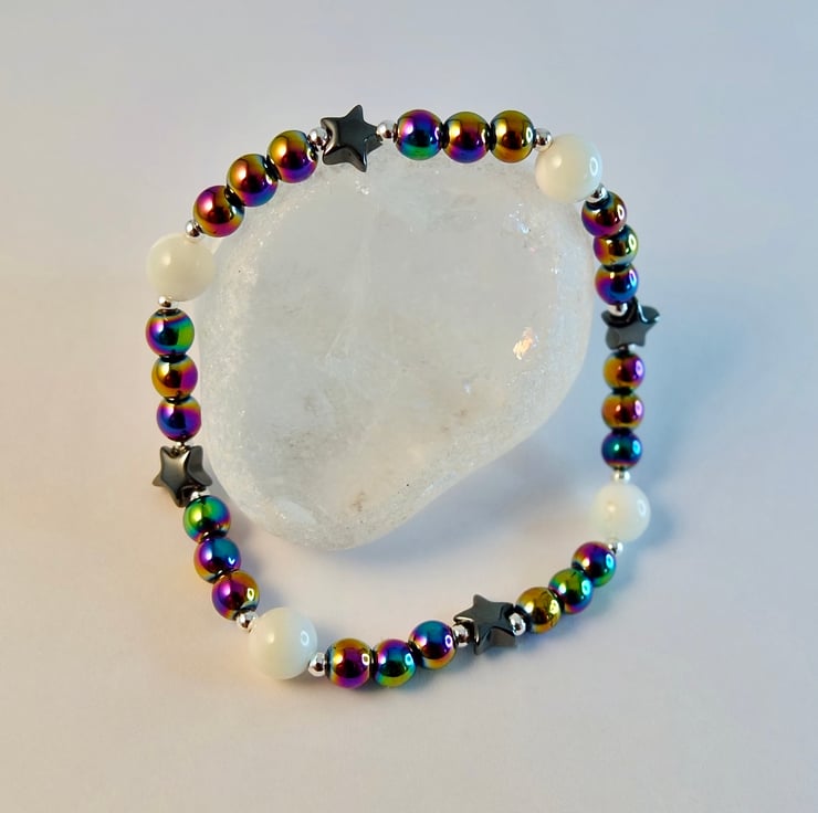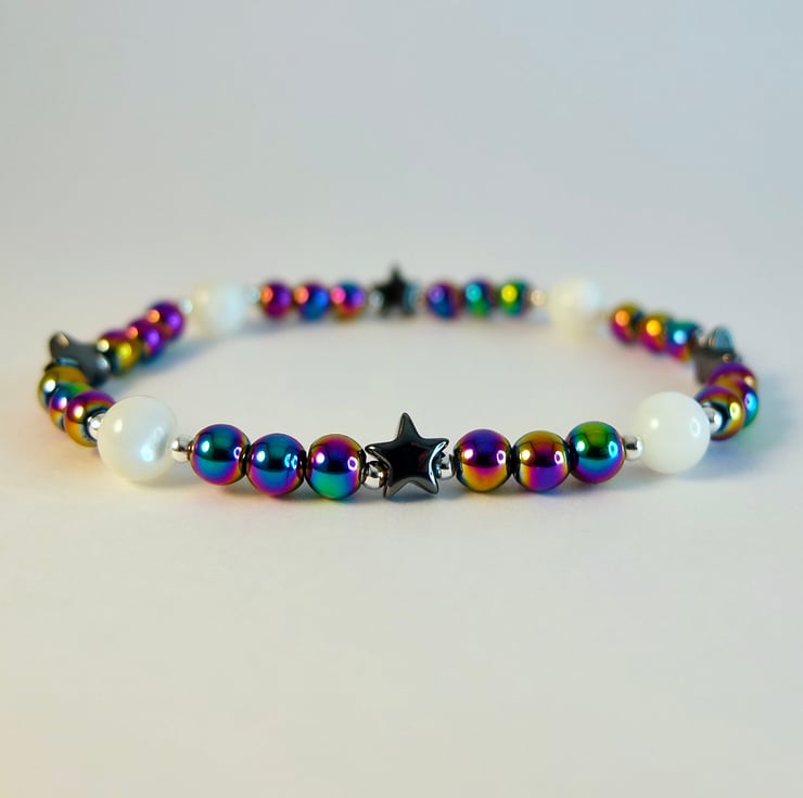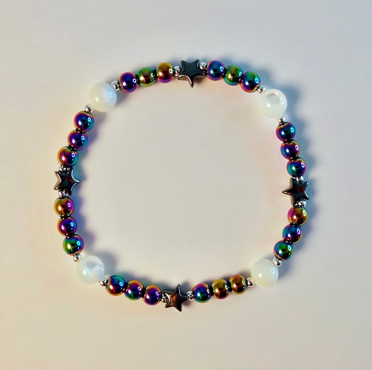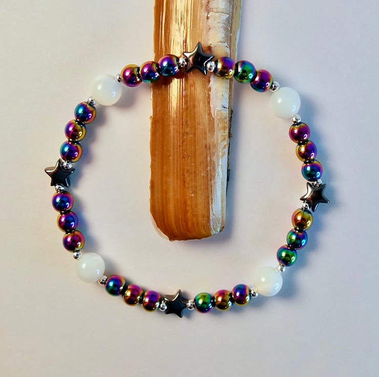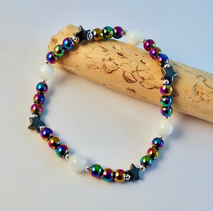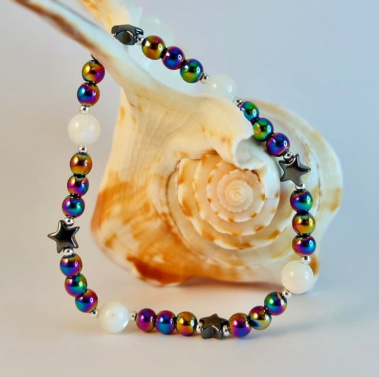 Pretty bracelet with 4mm Rainbow Hematite beads set with 6mm Mother-of-Pearl and 6x4mm Hematite puffed stars.