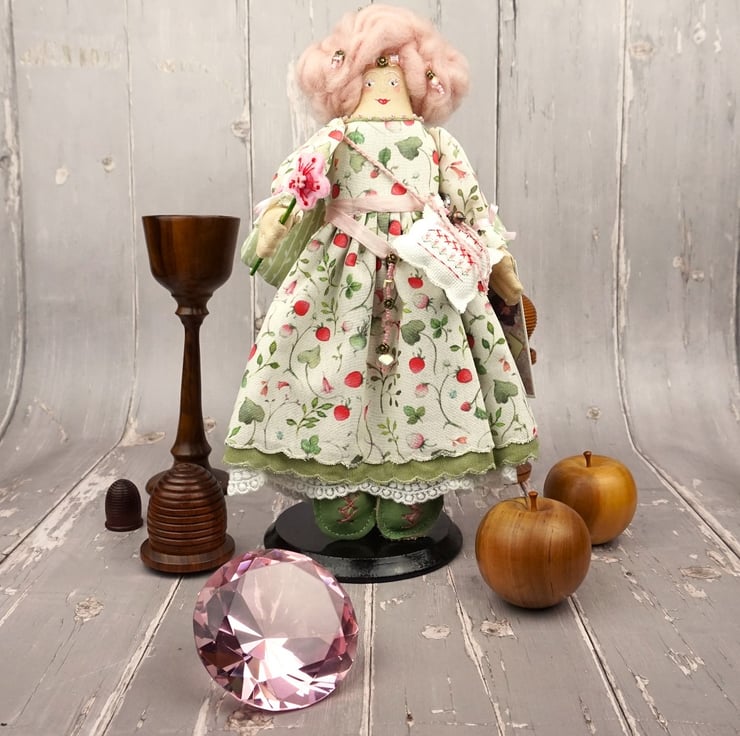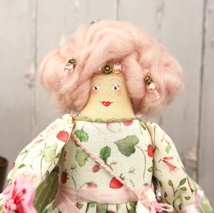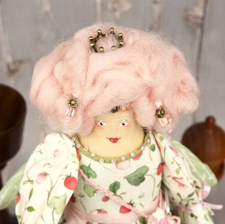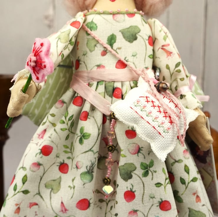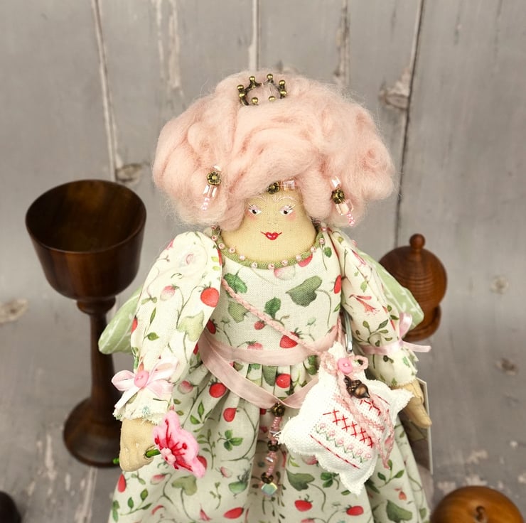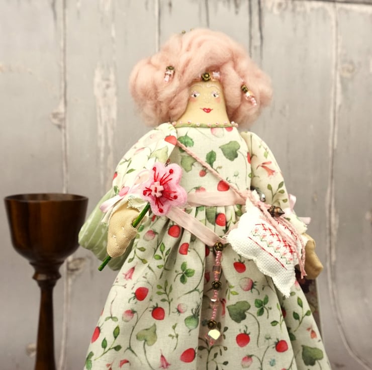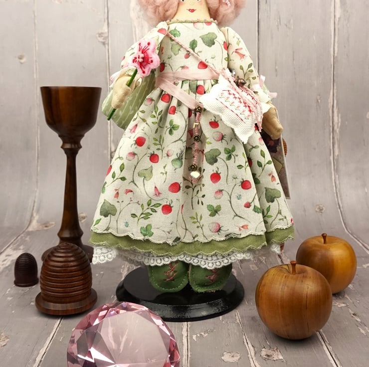 This is Martha, a strawberry Fairy Queen. A smaller pattern, she is about two thirds the size of my witch. This little Fairy Queen has an Acufactum print dress called Strawberry Field with a white ground and flowers and fruits abounding. The fruit is painted so delicately that the whole fabric is beautifully subtle.. She has wings that team her underskirt and sports a little felt wand. Her shoes are the smallest I have ever made and are leather. She has a piece of Rose quartz to her heart with rosemary in her stuffing and is finished with tiny buttons, silk ribbon and a little coronet in her hair. Her hair is hand styled into gothic proportions with glass and crystal bead details and a head piece to add to the medieval feel.